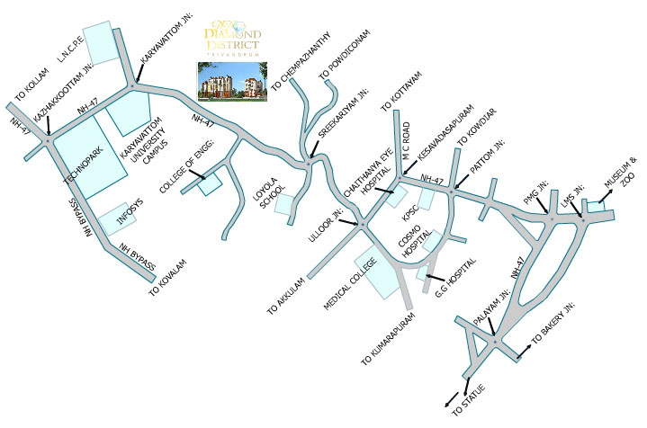 Desai Homes first project at Trivandrum and comprising 2 and 3 bedroom premium apartments in three blocks, DD Diamond District is situated adjacent to and facing the National Highway 47. Strategically located between and in close proximity to the information technology hub Techno Park.