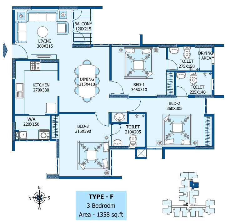 Vitrified tiles in Drawing/dining hall and good quality ceramic tiles in other areas