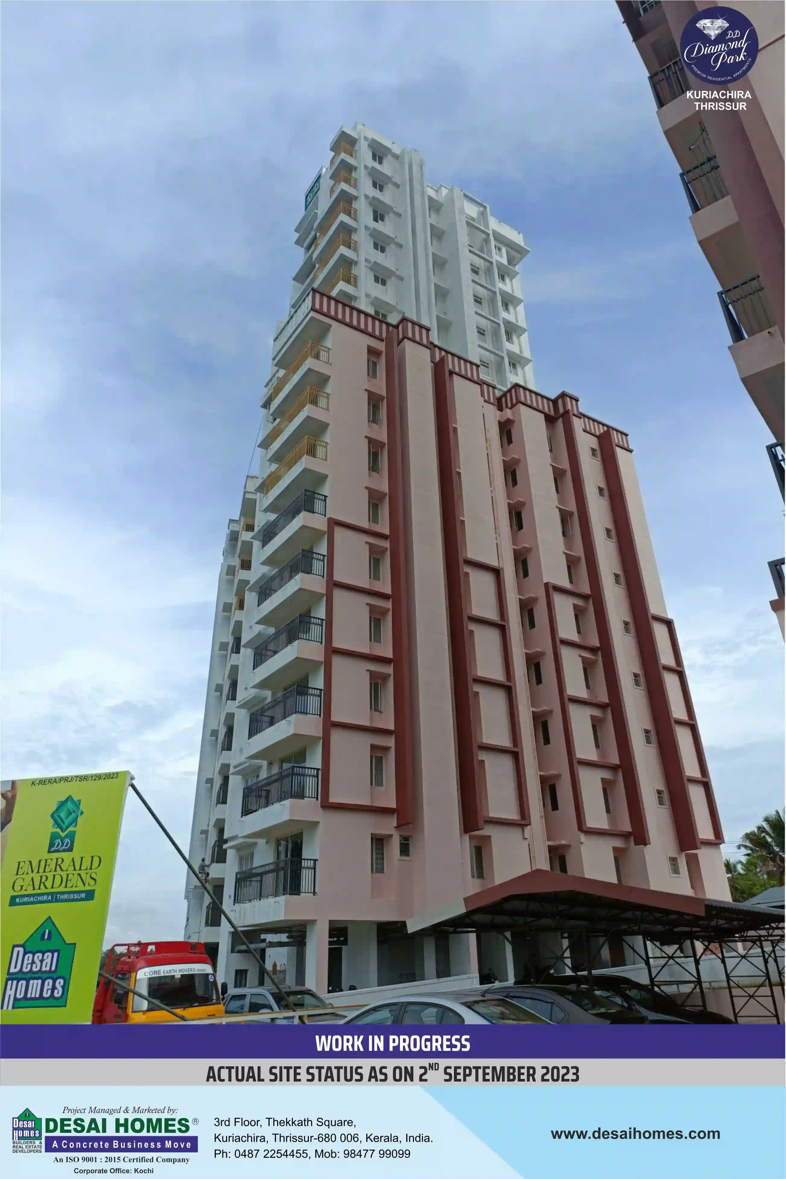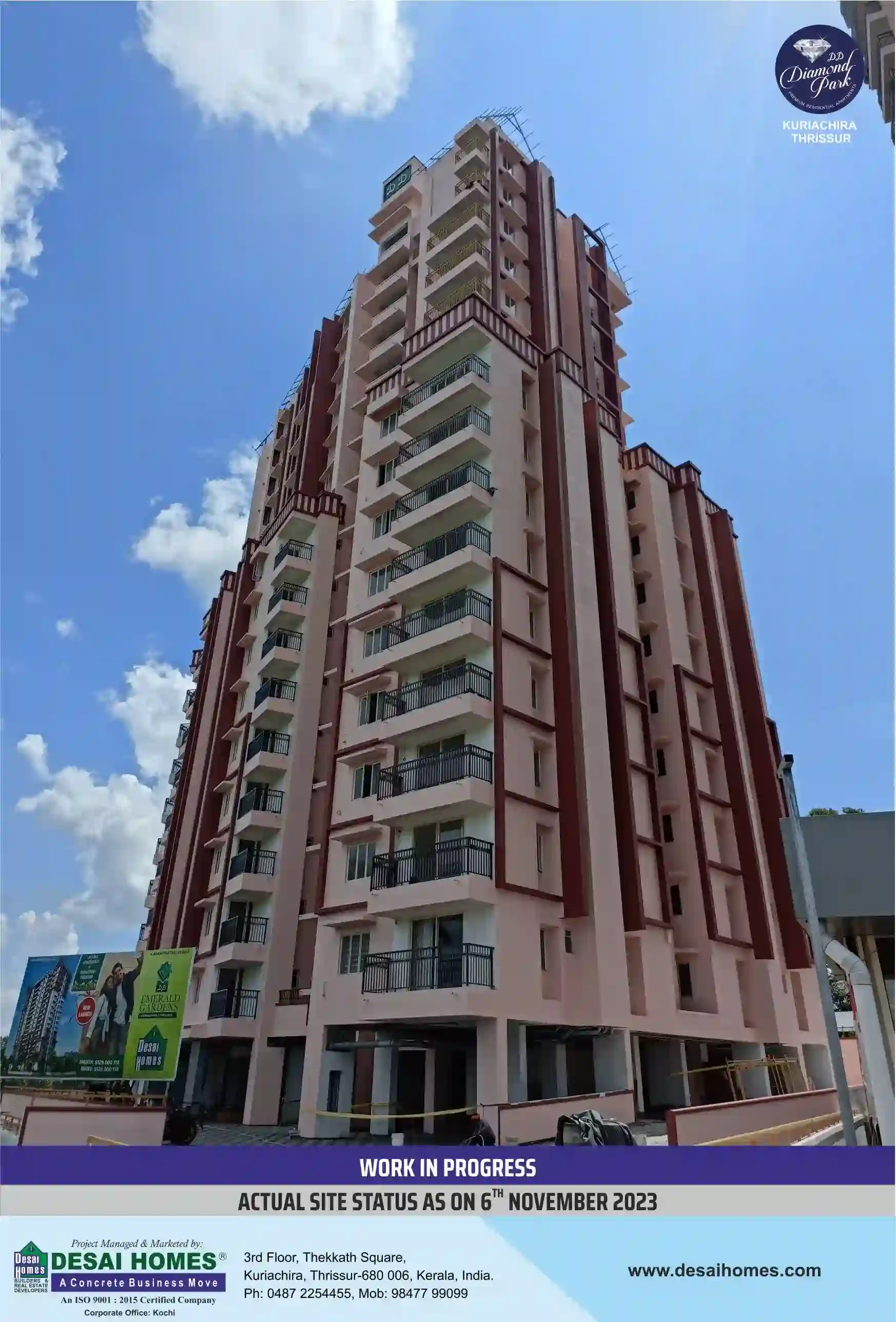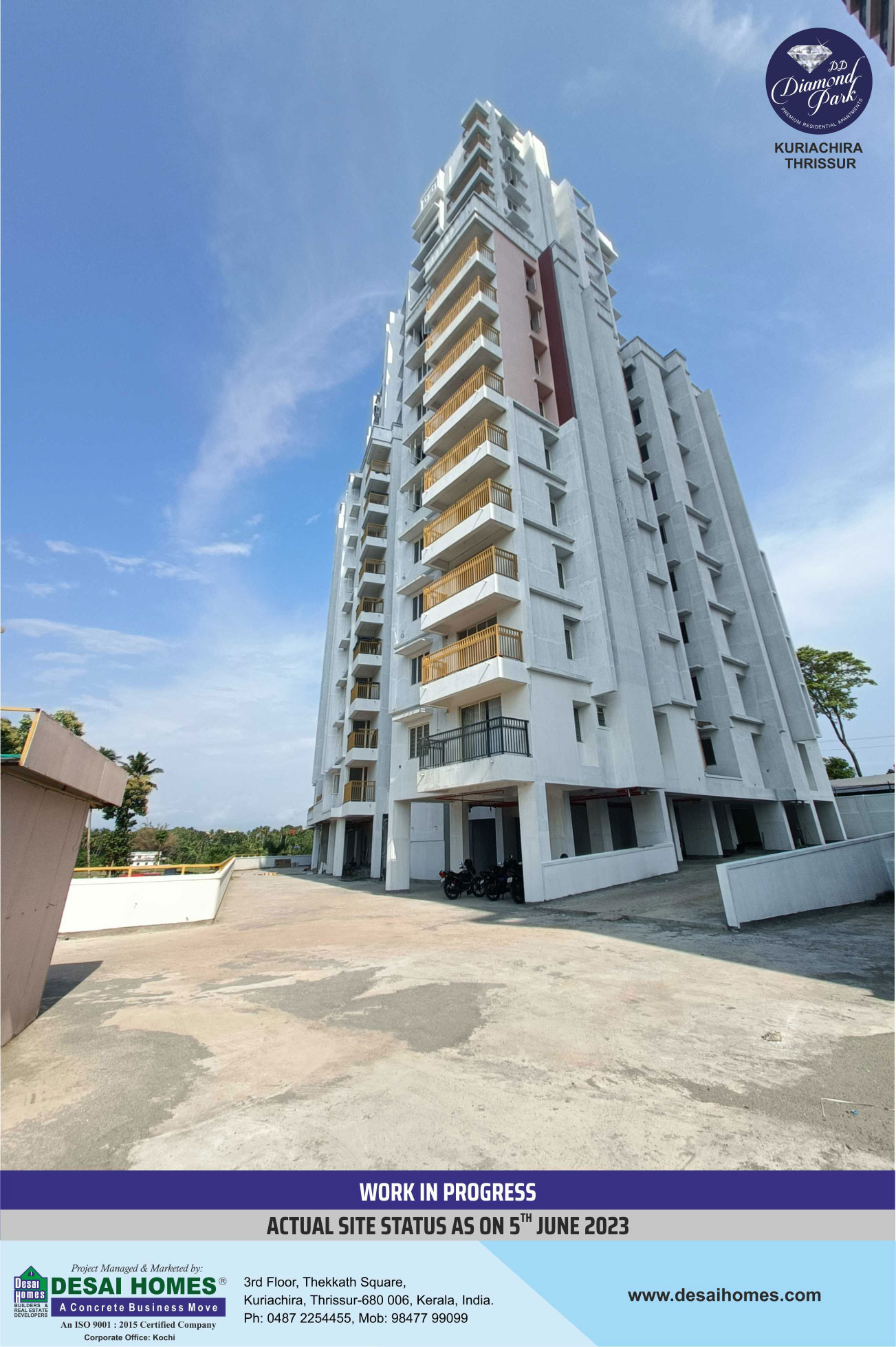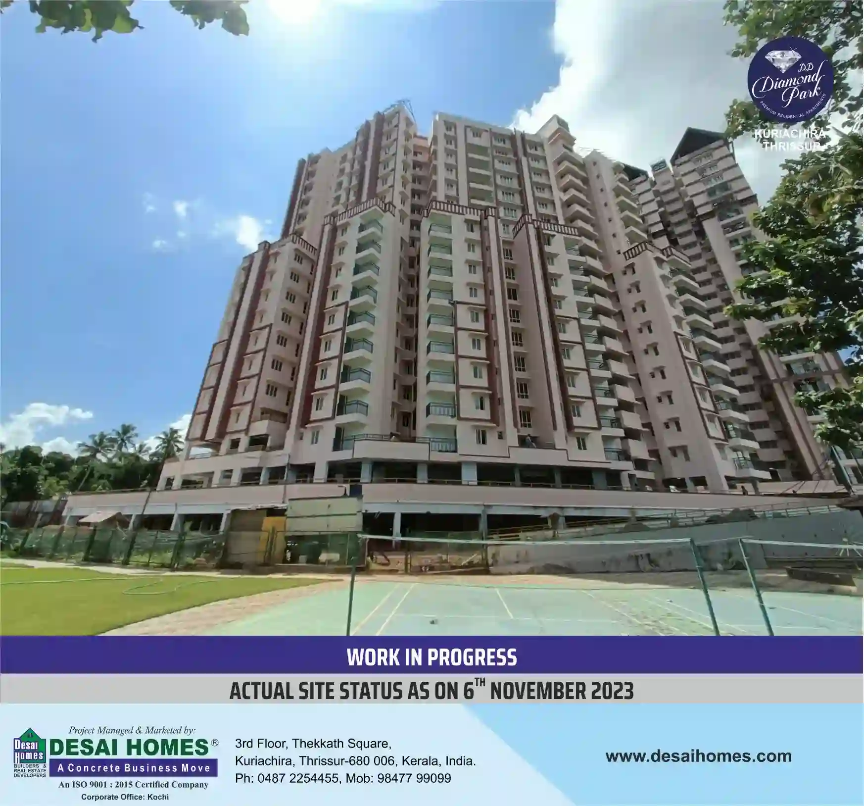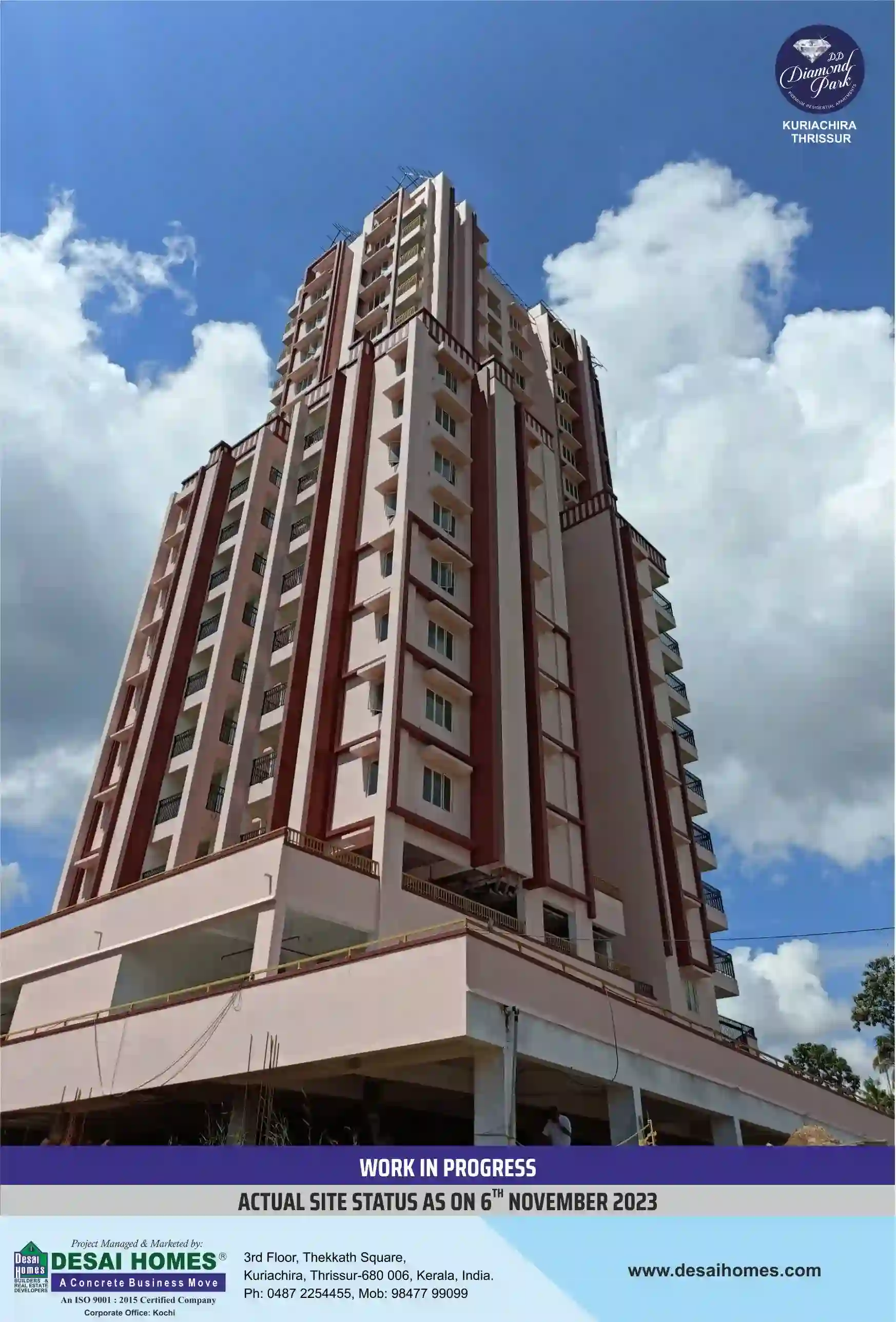 With the new launch of DD Diamond Park, Desai Homes bring to you the experience of a premium lifestyle alongside the calmness and serene beauty of nature. Located at Kuriachira, one of the posh residential areas in Thrissur, DD Diamond Park offers you exquisite living with world-class amenities and every luxury you have ever yearned for. In an area of more than an acre, with 16 floors of 2 BHK, 3 BHK and Duplex apartments DD Diamond Park cocoons the best of everything you have desired. Experience the eternal golden status of premium living at DD Diamond Park.