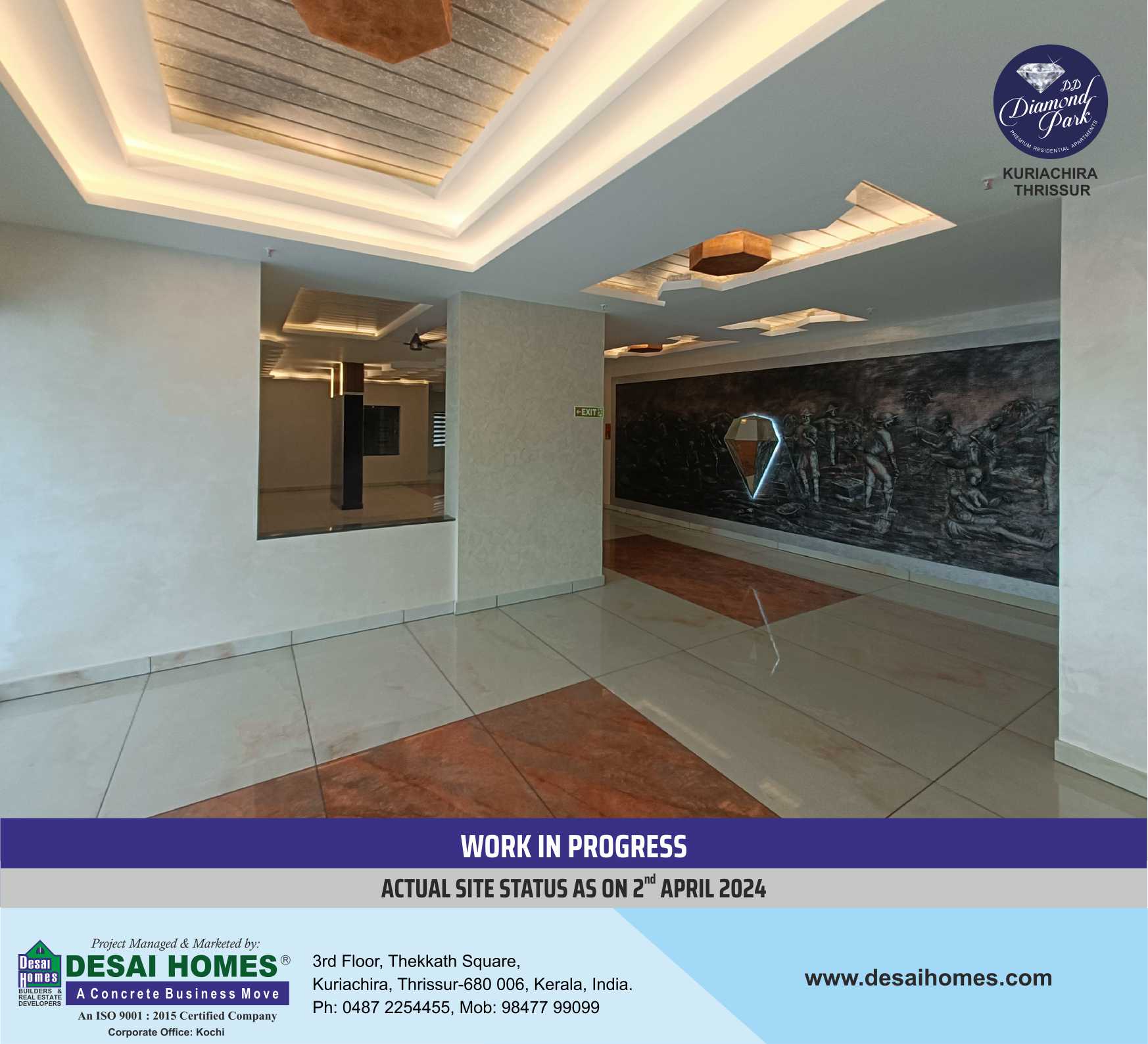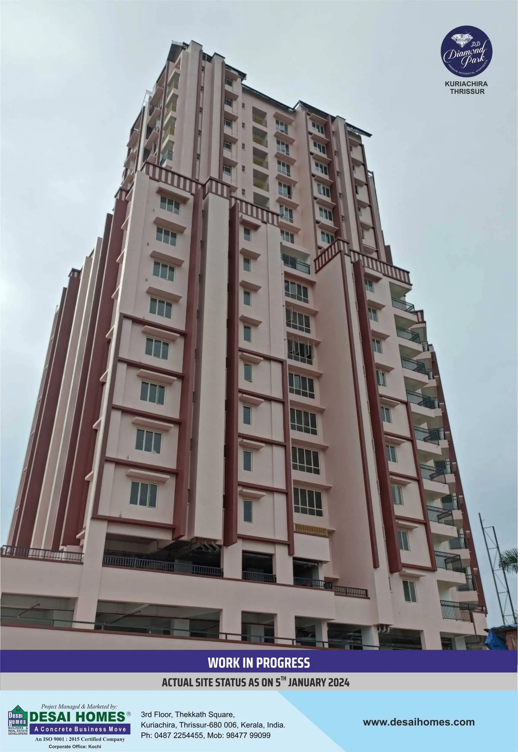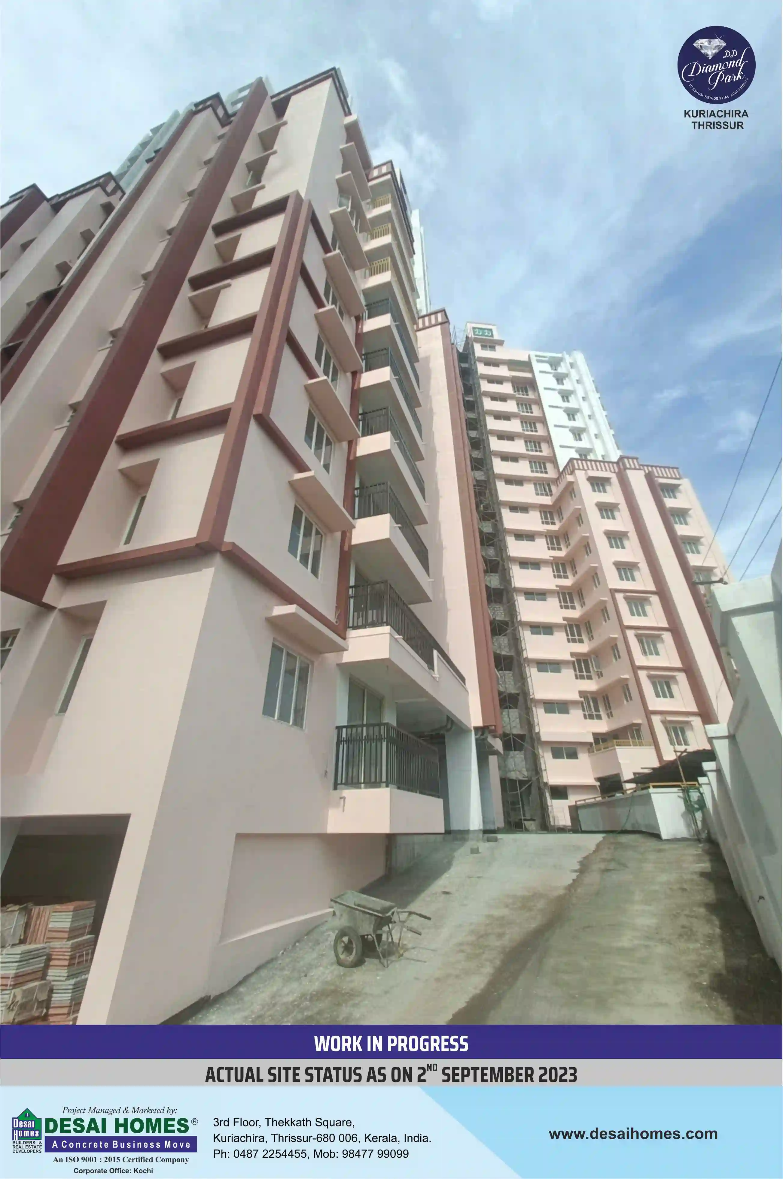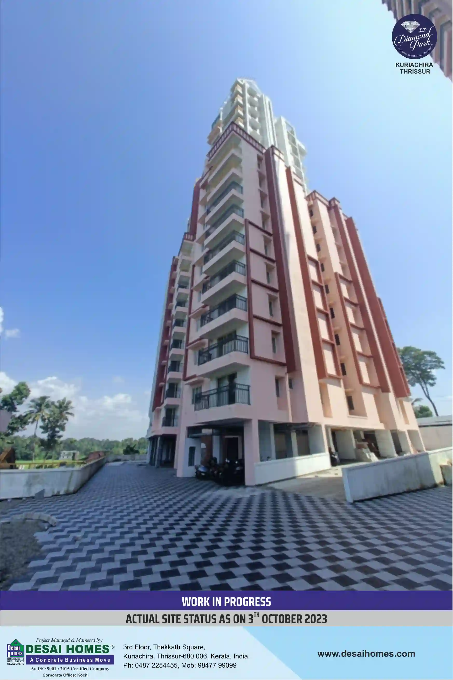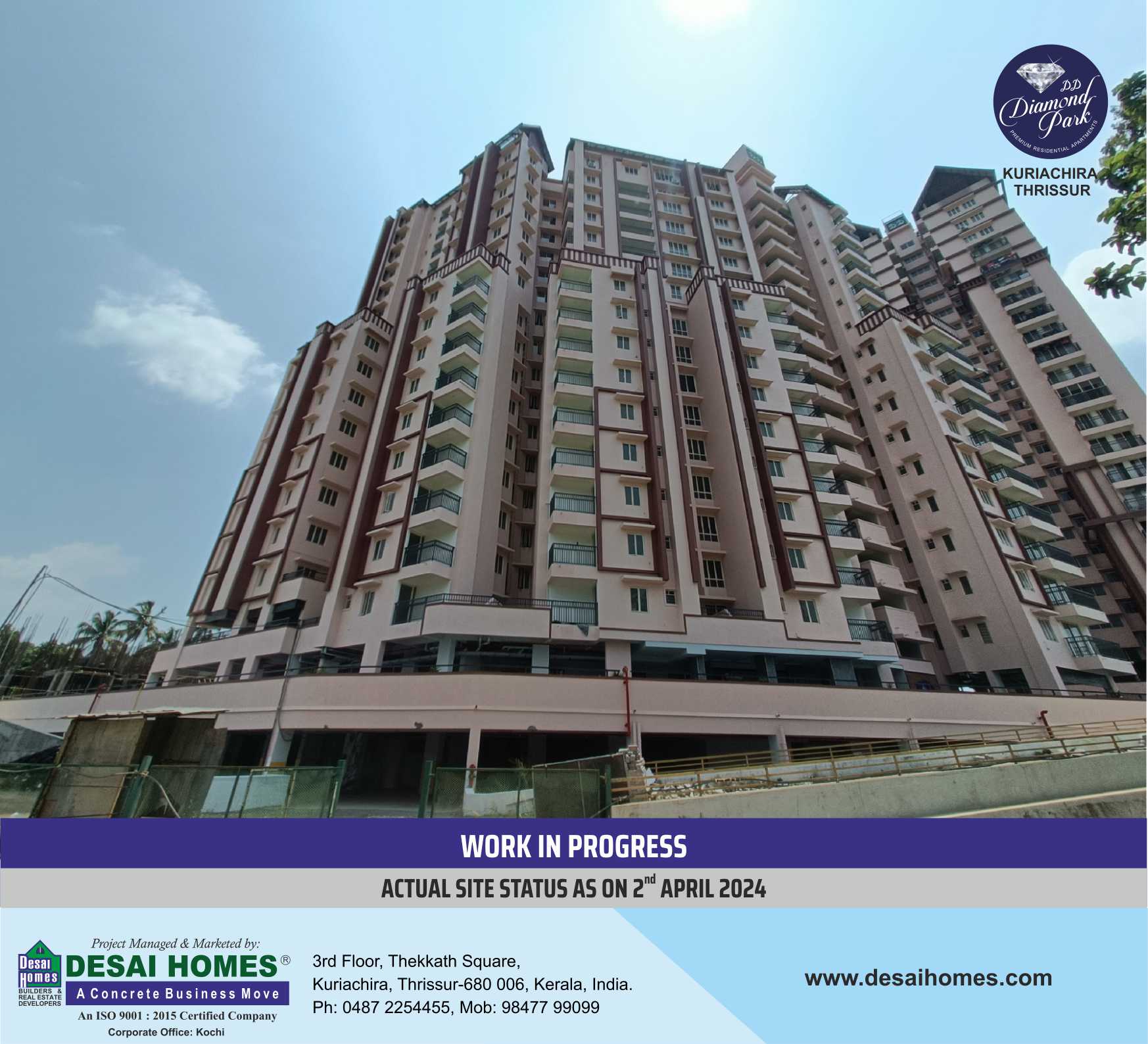 With the new launch of DD Diamond Park, Desai Homes bring to you the experience of a premium lifestyle alongside the calmness and serene beauty of nature. Located at Kuriachira, one of the posh residential areas in Thrissur, DD Diamond Park offers you exquisite living with world-class amenities and every luxury you have ever yearned for. In an area of more than an acre, with 16 floors of 2 BHK, 3 BHK and Duplex apartments DD Diamond Park cocoons the best of everything you have desired. Experience the eternal golden status of premium living at DD Diamond Park.