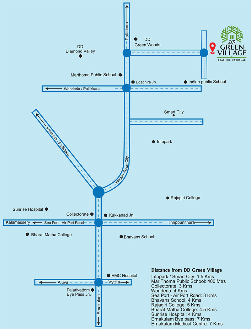 This latest project from Desai Homes, situated in Edachira, Kakkanad, is the perfect abode for those looking to settle down in the suburban landscape of Kochi. The prime location of this project is its biggest highlight - close to SmartCity, Infopark, Phase II of Kochi Metro, major schools & hospitals, etc. Enjoy the charm of city life sans the hustle and bustle here at DD Green Village!