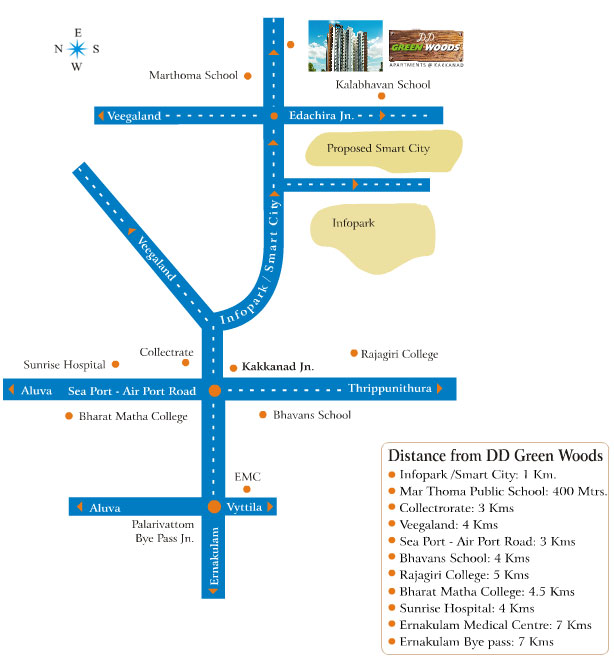 Project completed before schedule. DD Green Woods is comprised of 102 apartments set in a conjoined cluster of blocks with a slightly futuristic design on the exterior, situated between the information technology hubs Smart City and the Info Park in Kakkanad, in close proximity to prominent educational institutions in the area.