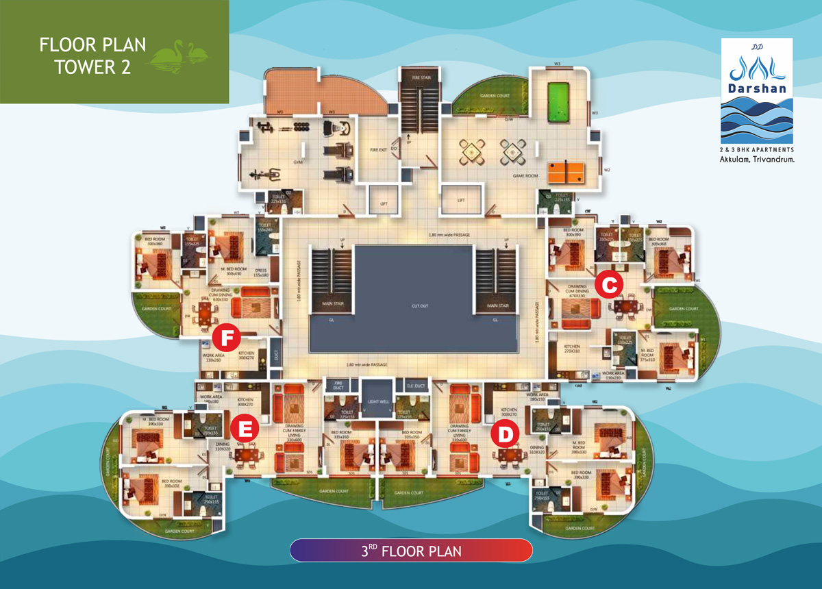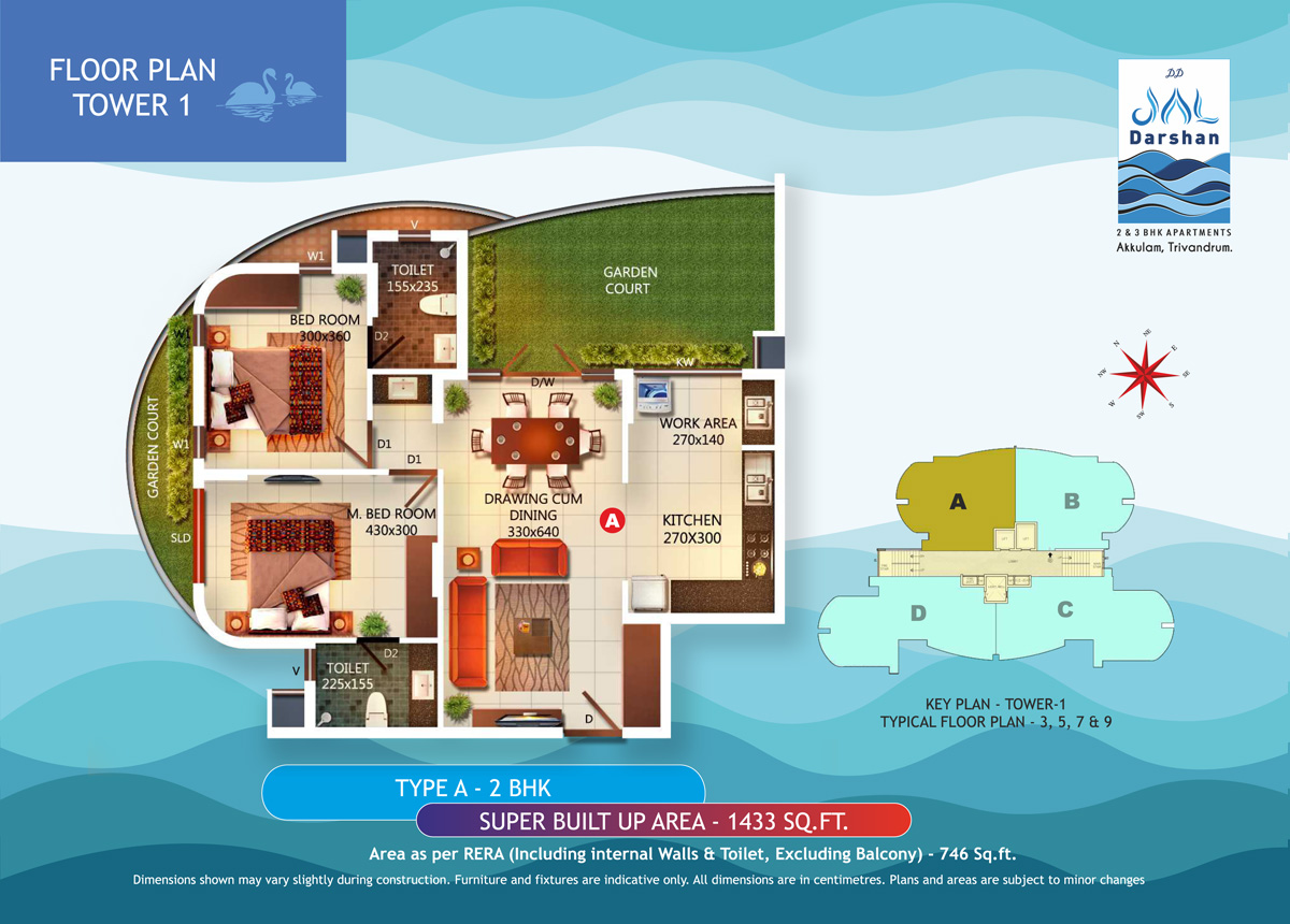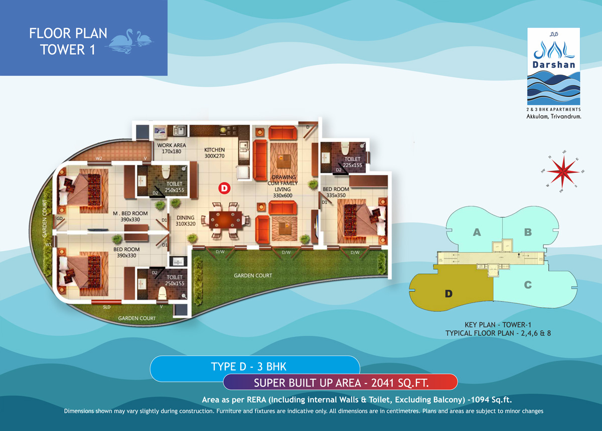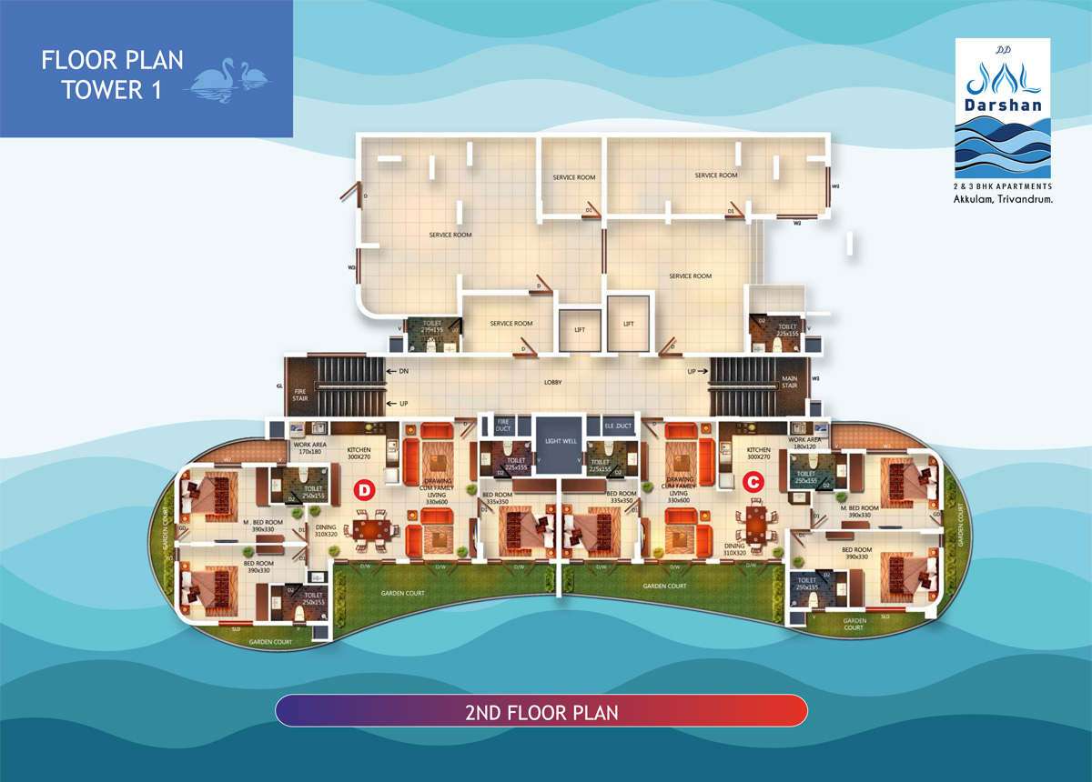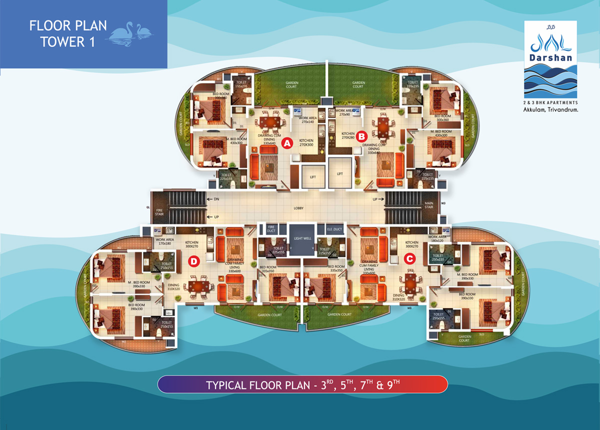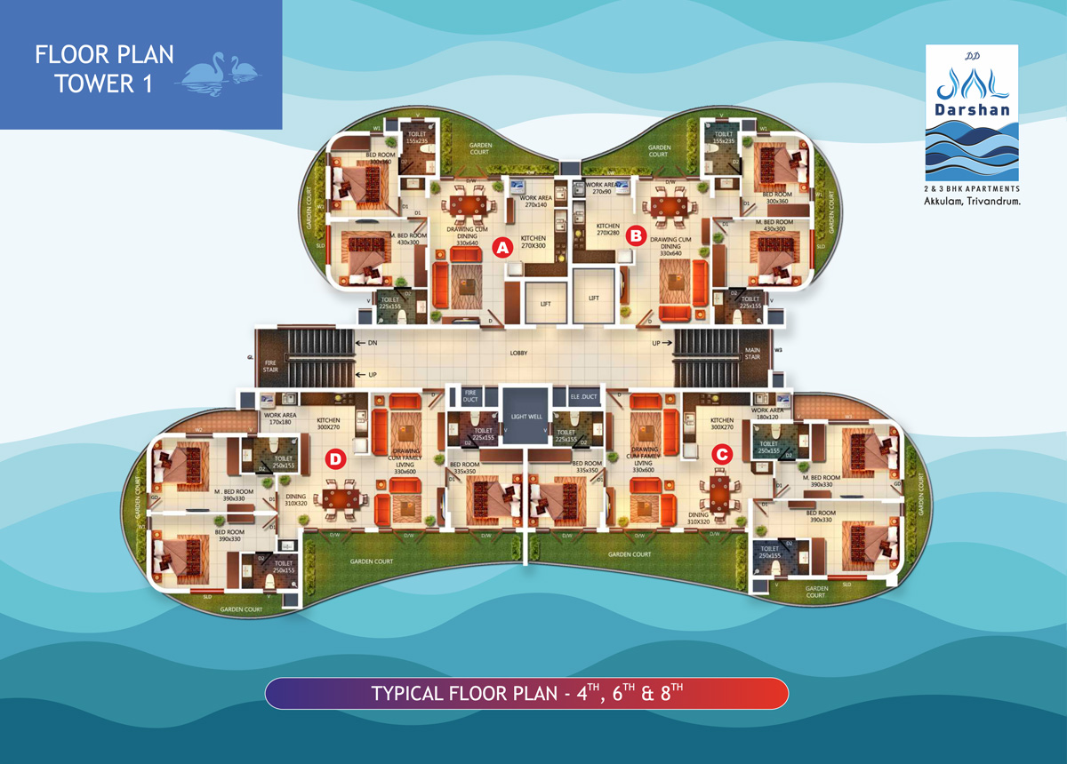 DD Jal Darshan, the twin tower waterfront apartment project of Desai Homes is located at Akkulam, Trivandrum. Spread over nearly an acre of land, the twin towers with a total of 70 units - Tower 1 with 30 units and Tower 2 with 40 units - consisting of 2 & 3 BHK luxury apartments ranging from 1192 sq.ft to 2041 sq. ft, DD Jal Darshan lets you invoke the true spirits of rejuvenated living. This skilfully designed project stands out for both its serene ambiance as well as the modern facilities.