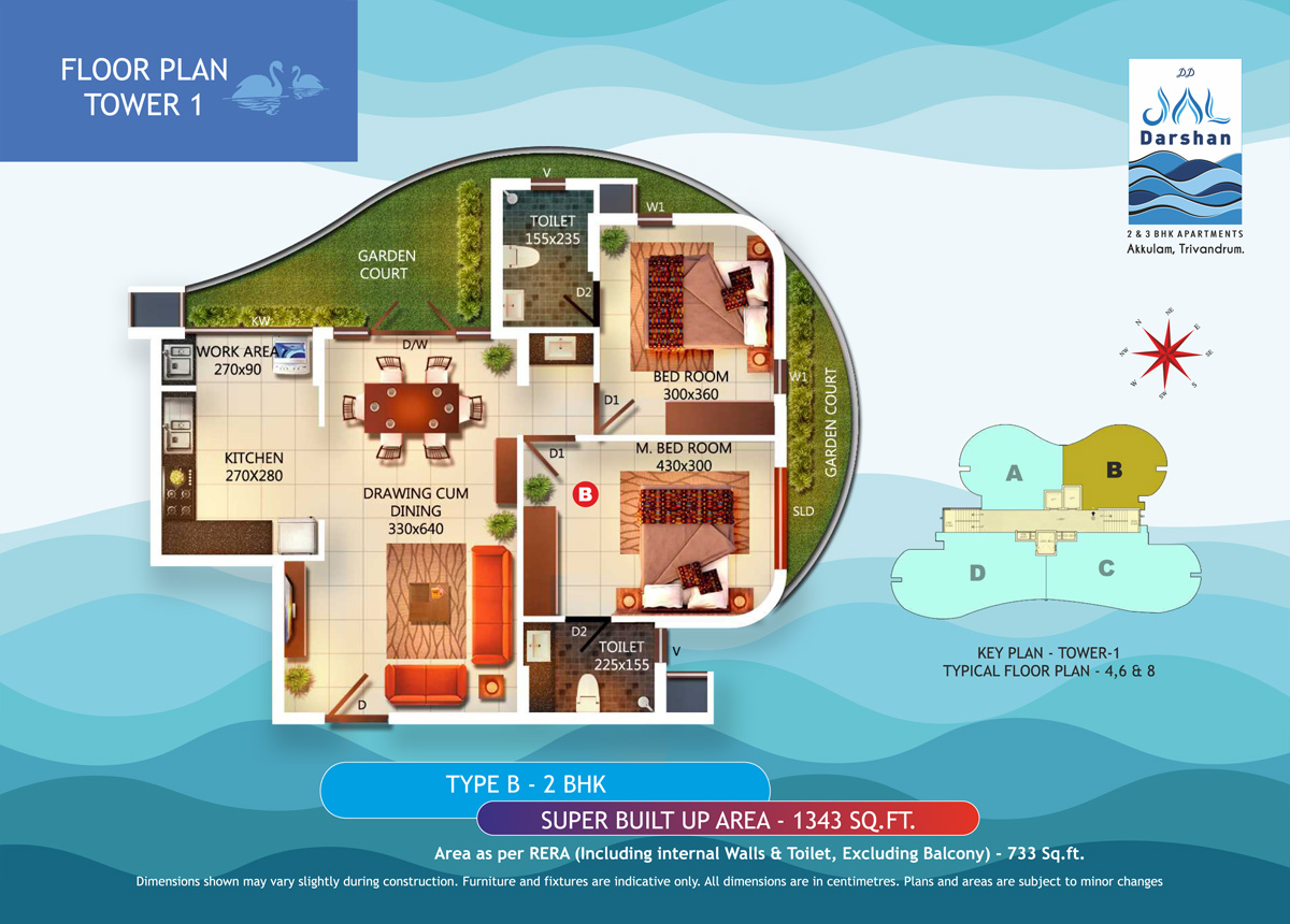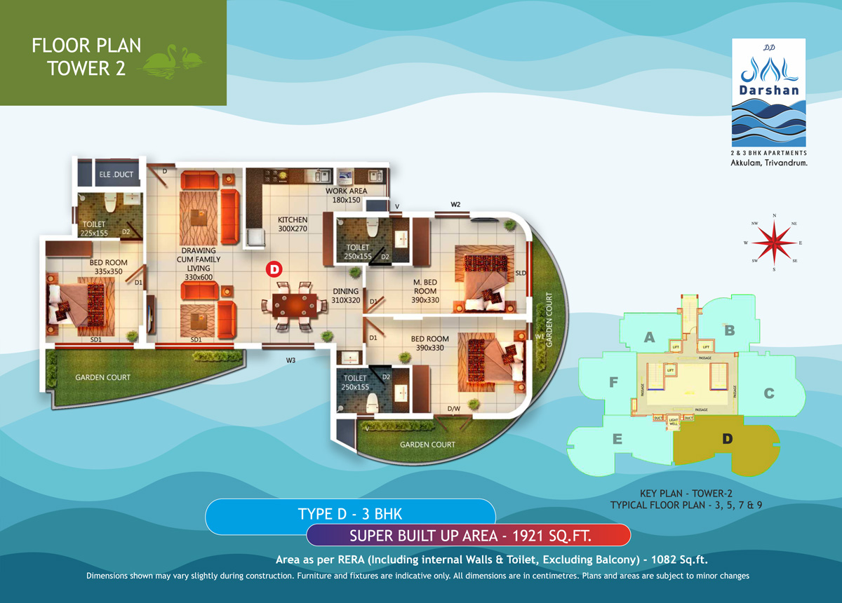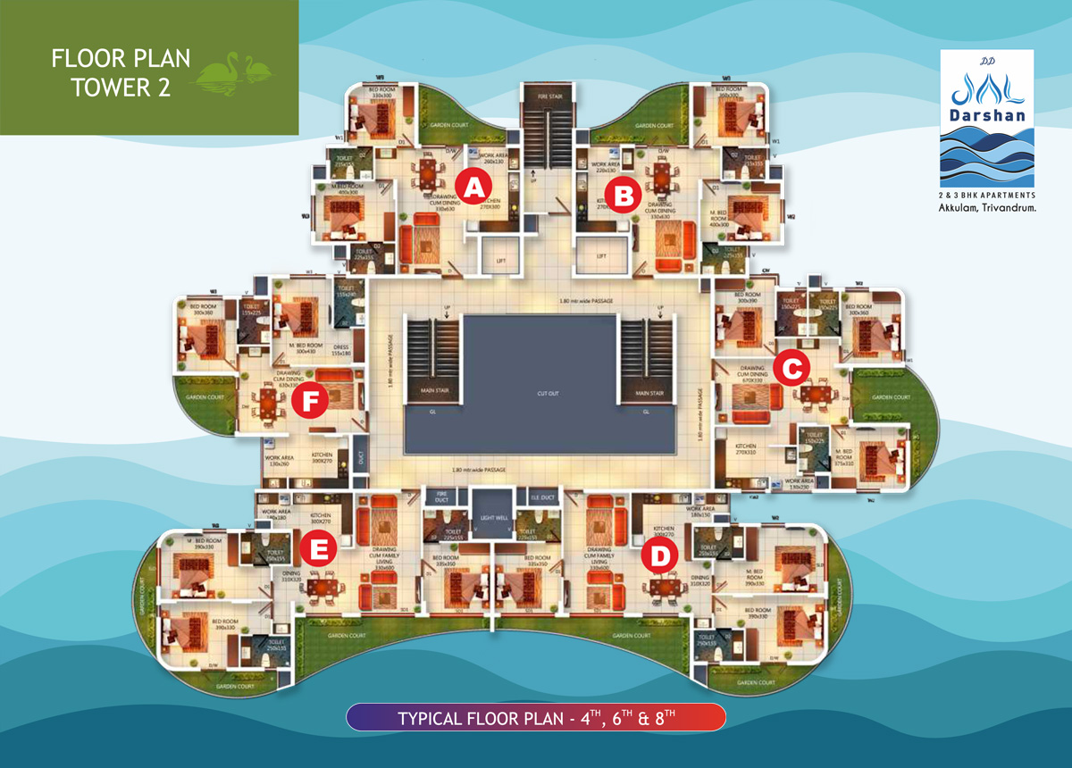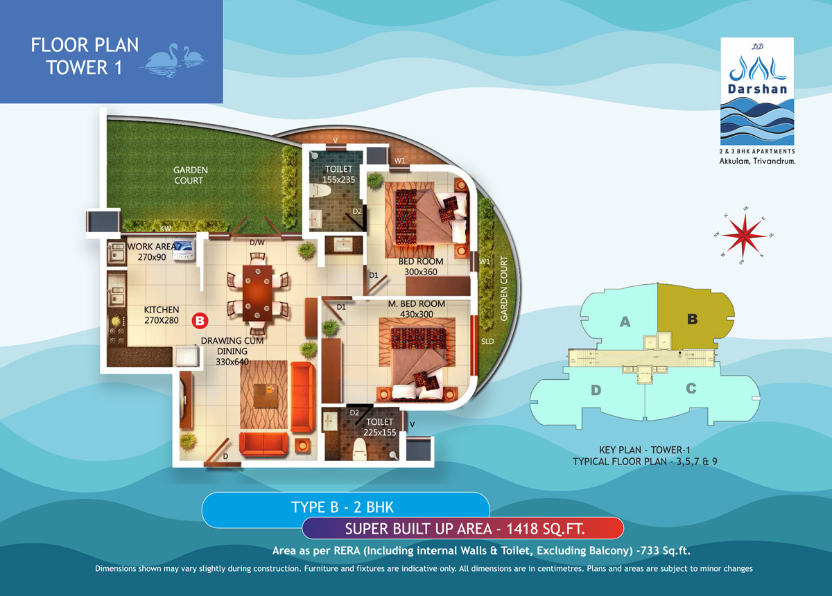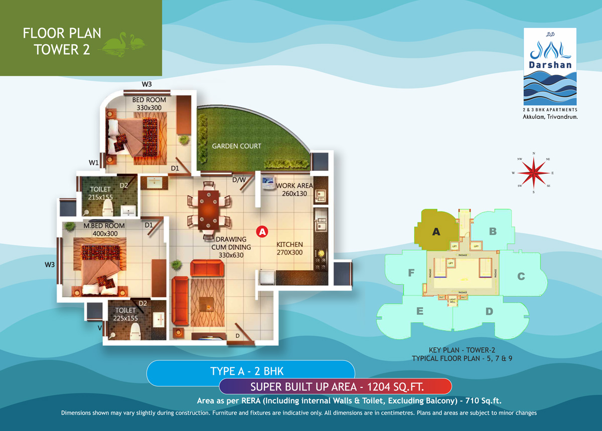 DD Jal Darshan, the twin tower waterfront apartment project of Desai Homes is located at Akkulam, Trivandrum. Spread over nearly an acre of land, the twin towers with a total of 70 units - Tower 1 with 30 units and Tower 2 with 40 units - consisting of 2 & 3 BHK luxury apartments ranging from 1192 sq.ft to 2041 sq. ft, DD Jal Darshan lets you invoke the true spirits of rejuvenated living. This skilfully designed project stands out for both its serene ambiance as well as the modern facilities.