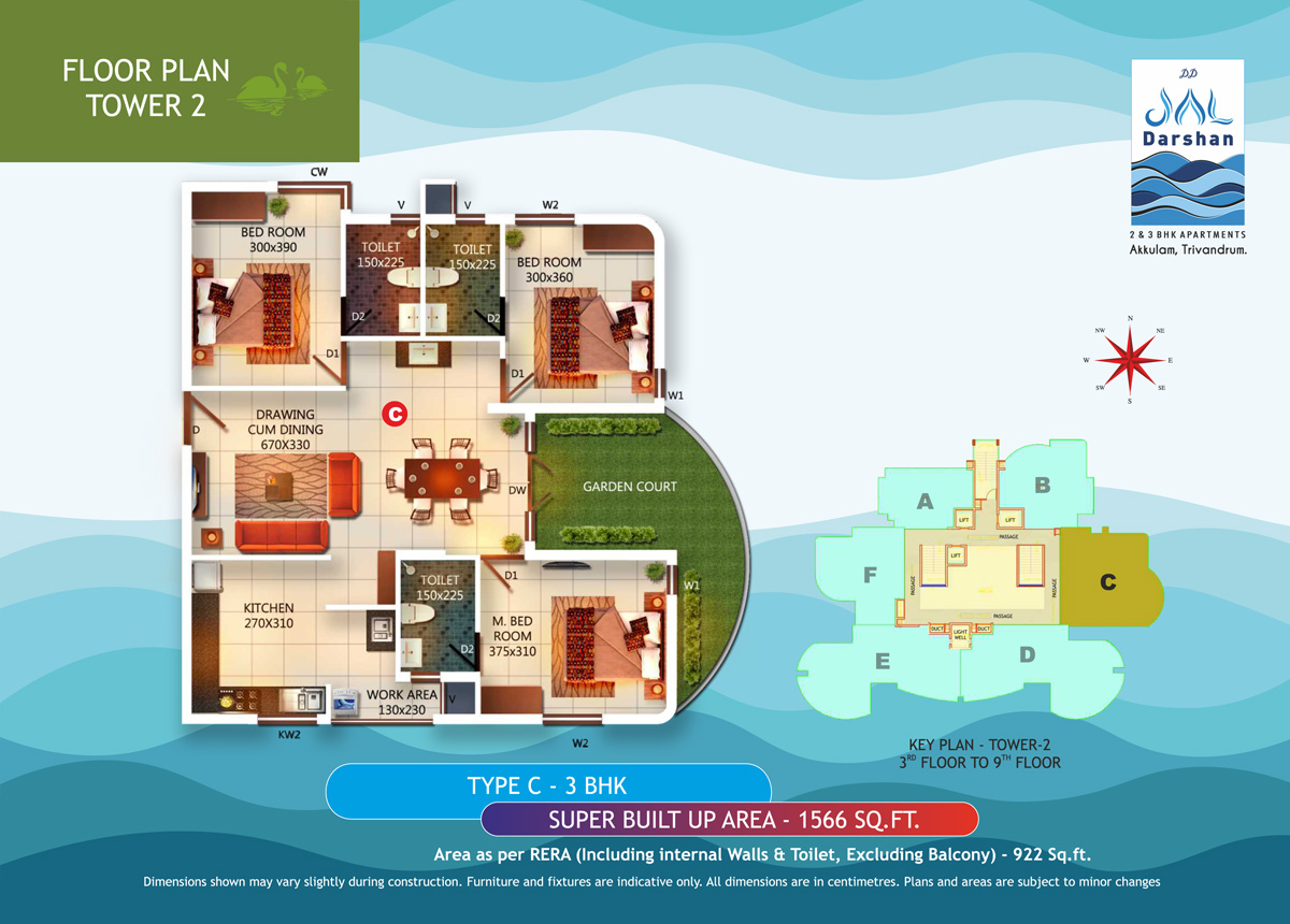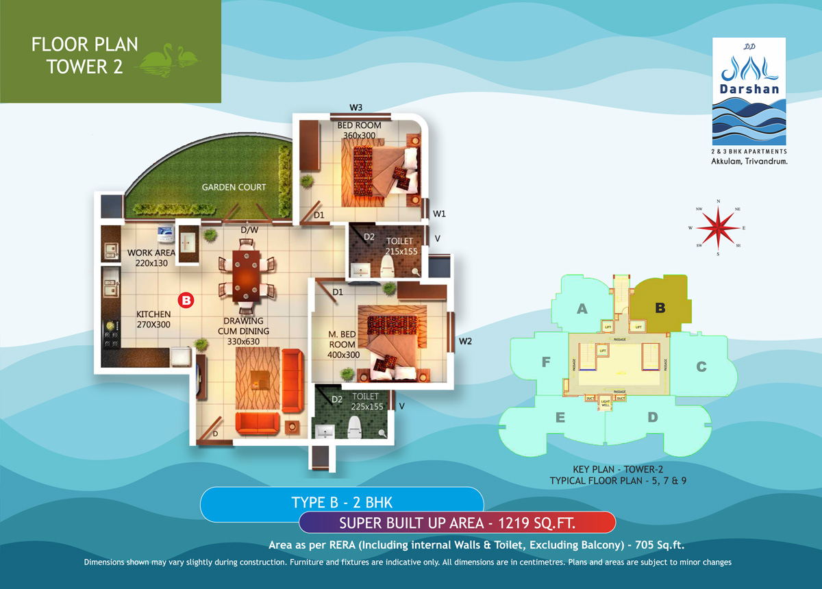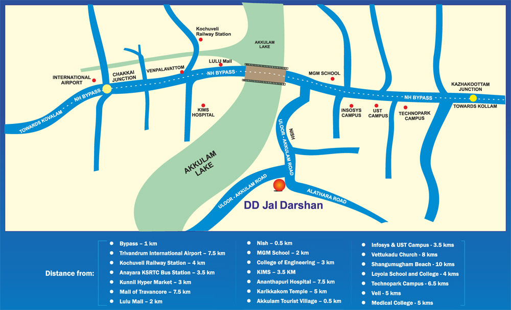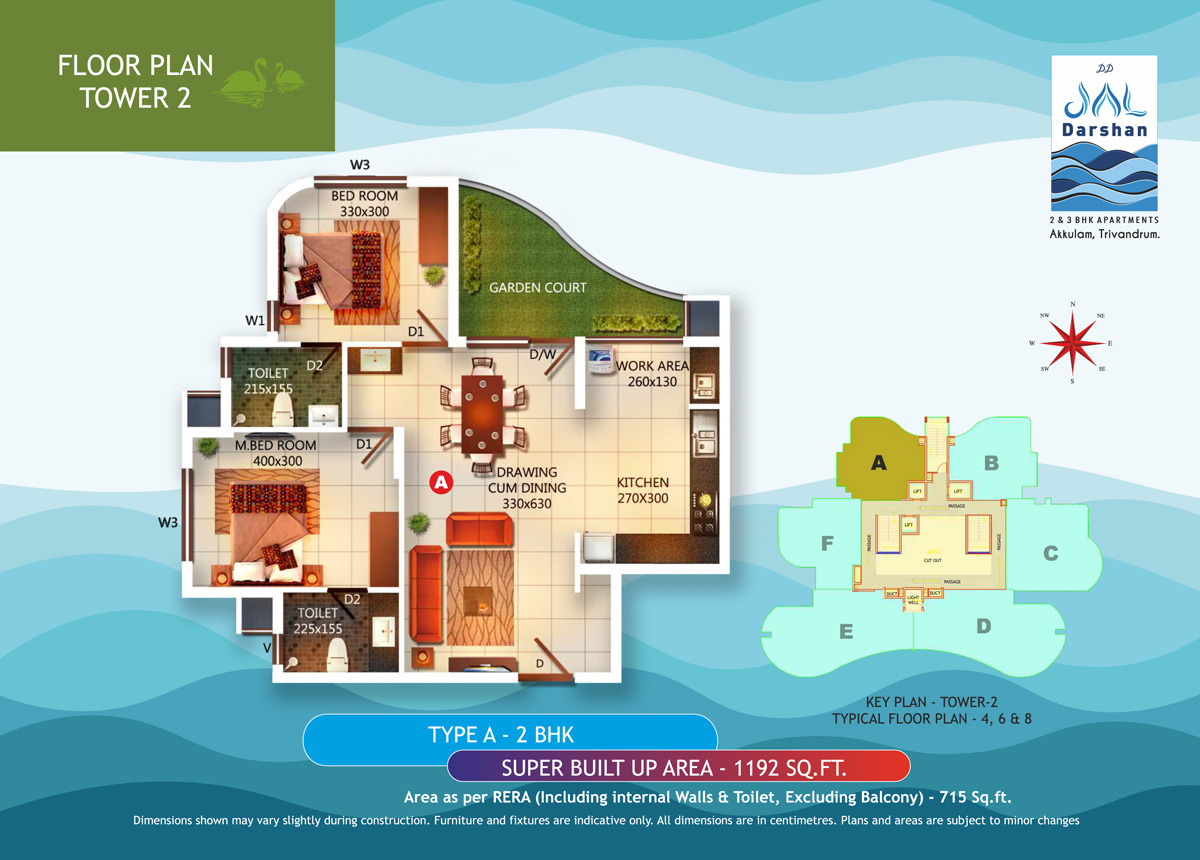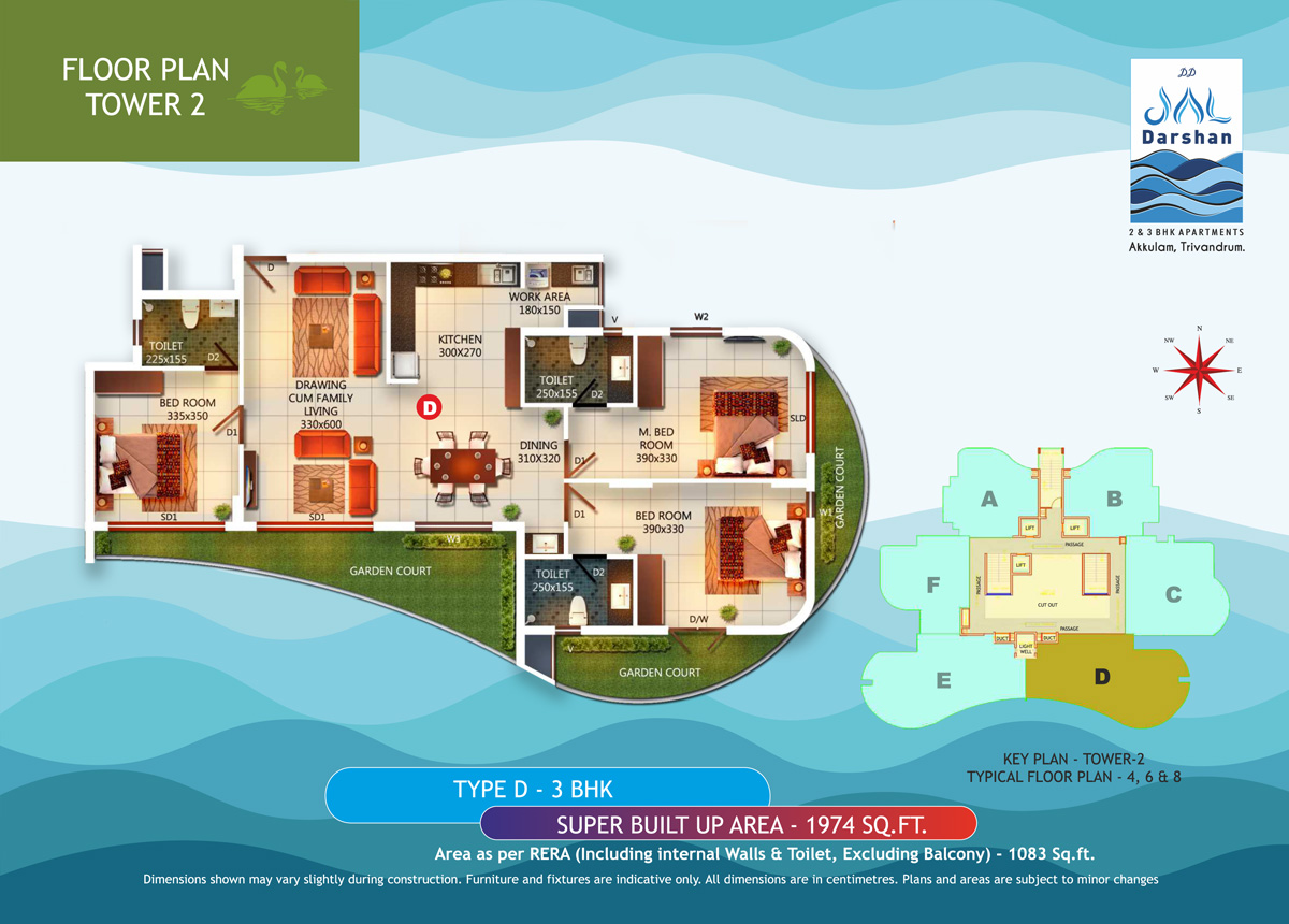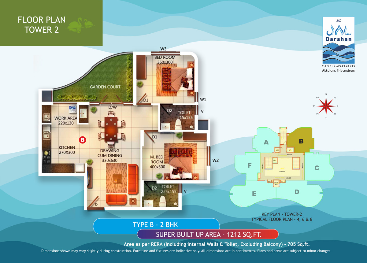 DD Jal Darshan, the twin tower waterfront apartment project of Desai Homes is located at Akkulam, Trivandrum. Spread over nearly an acre of land, the twin towers with a total of 70 units - Tower 1 with 30 units and Tower 2 with 40 units - consisting of 2 & 3 BHK luxury apartments ranging from 1192 sq.ft to 2041 sq. ft, DD Jal Darshan lets you invoke the true spirits of rejuvenated living. This skilfully designed project stands out for both its serene ambiance as well as the modern facilities.