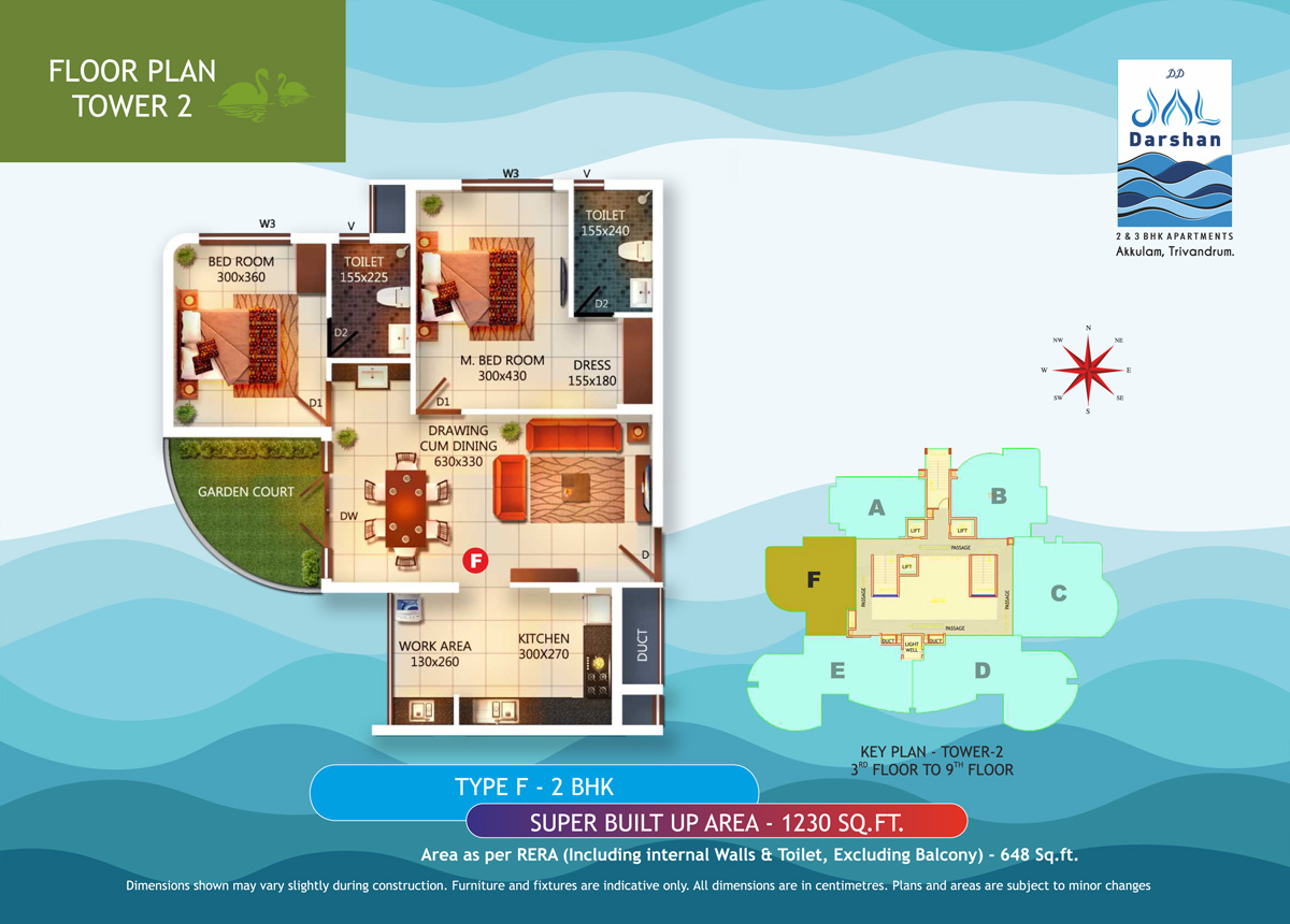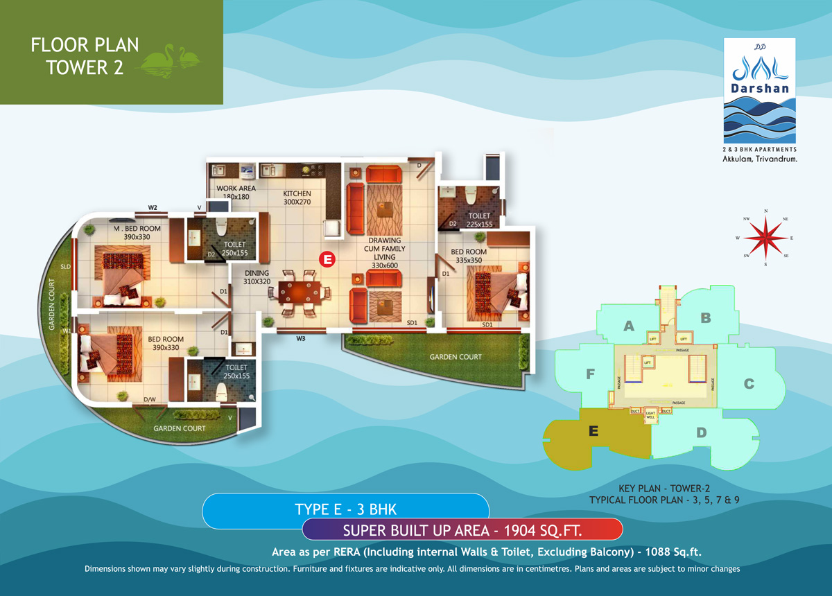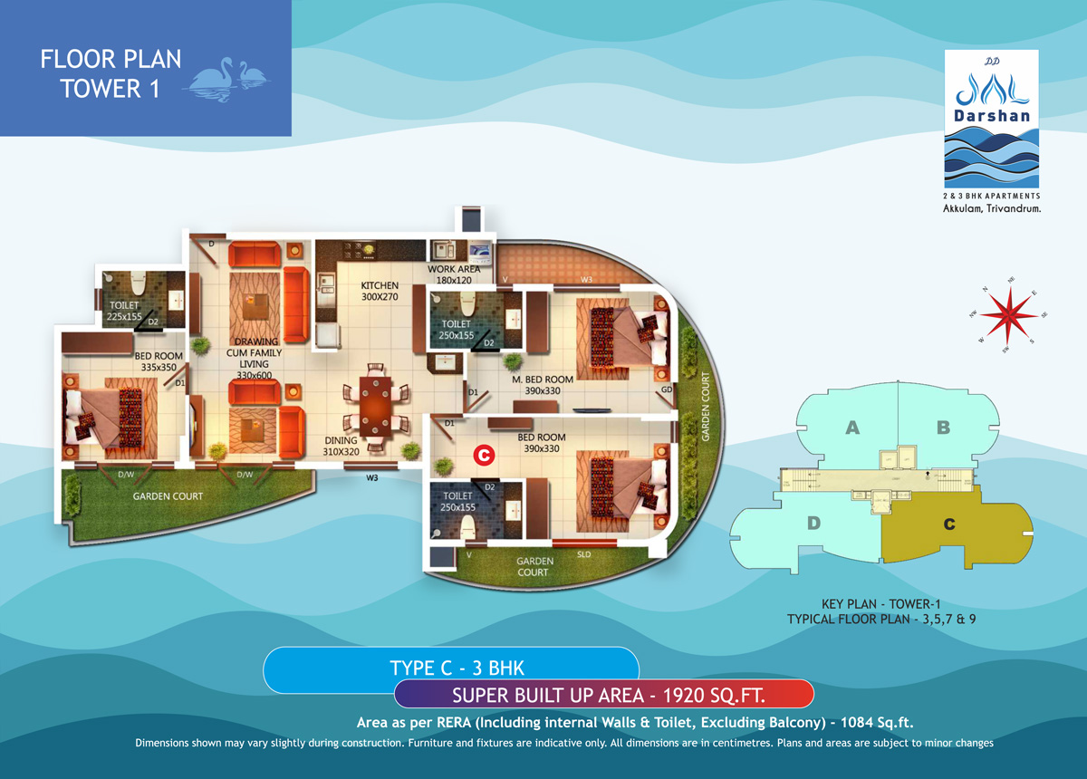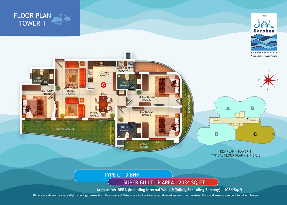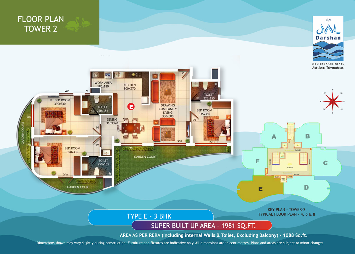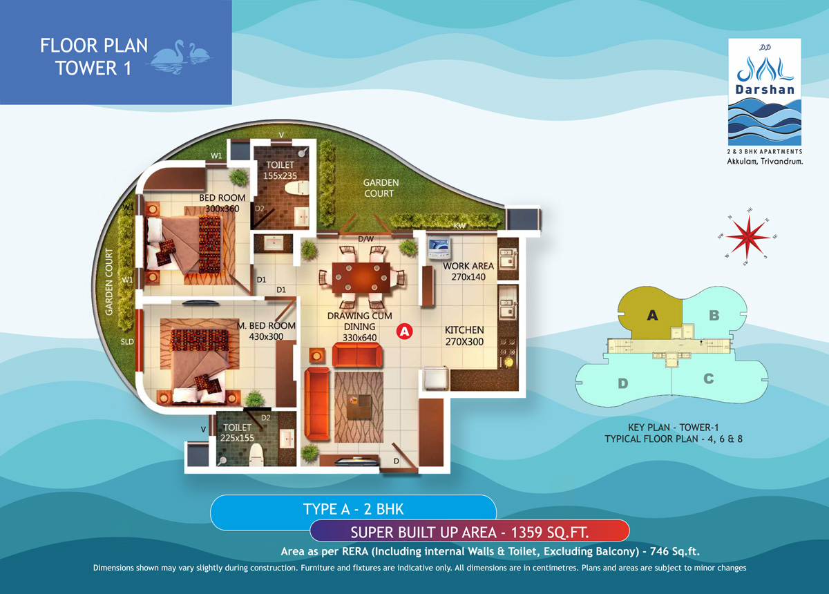 DD Jal Darshan, the twin tower waterfront apartment project of Desai Homes is located at Akkulam, Trivandrum. Spread over nearly an acre of land, the twin towers with a total of 70 units - Tower 1 with 30 units and Tower 2 with 40 units - consisting of 2 & 3 BHK luxury apartments ranging from 1192 sq.ft to 2041 sq. ft, DD Jal Darshan lets you invoke the true spirits of rejuvenated living. This skilfully designed project stands out for both its serene ambiance as well as the modern facilities.