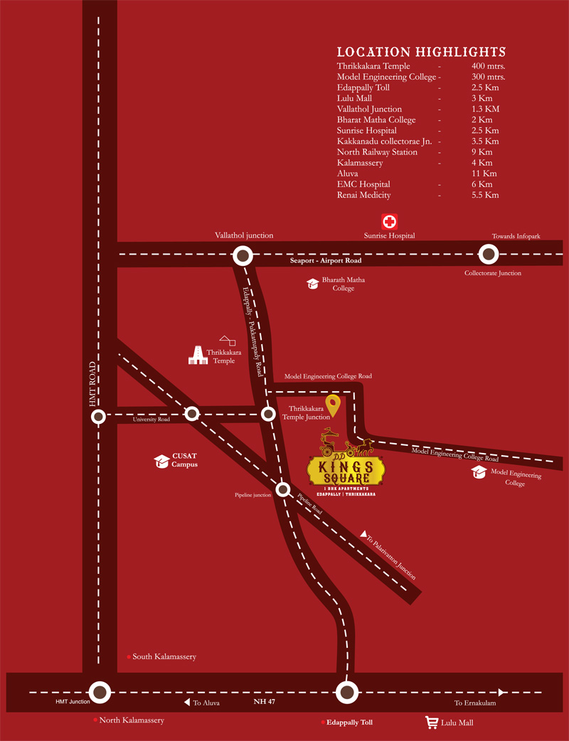 Like how every need of a King is taken care of, our location too serves your every need, with Lulu Mall just 3 kilometers away, all your daily essentials are just a hop away. This spot offers you everything you will ever need. Seaport-Airport road is just 1 km away. You are in the midst of two national highways passing through the town, giving you access to inter and intra district location. Being right next to Kakkanad means, you're connected to all the major IT parks of Kochi, CSEZ, Smart City, KINFRA and more, where job opportunities are aplenty. Be charged to indulge in a lifestyle of your imagination in this culturally and commercially rich land.