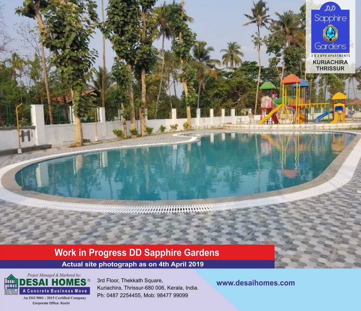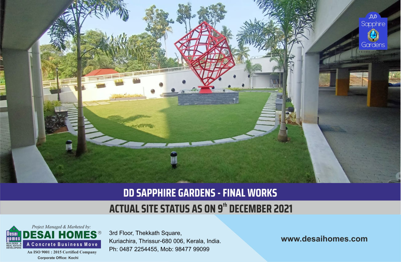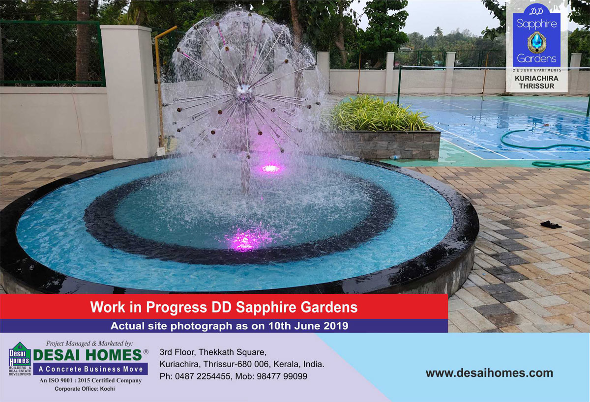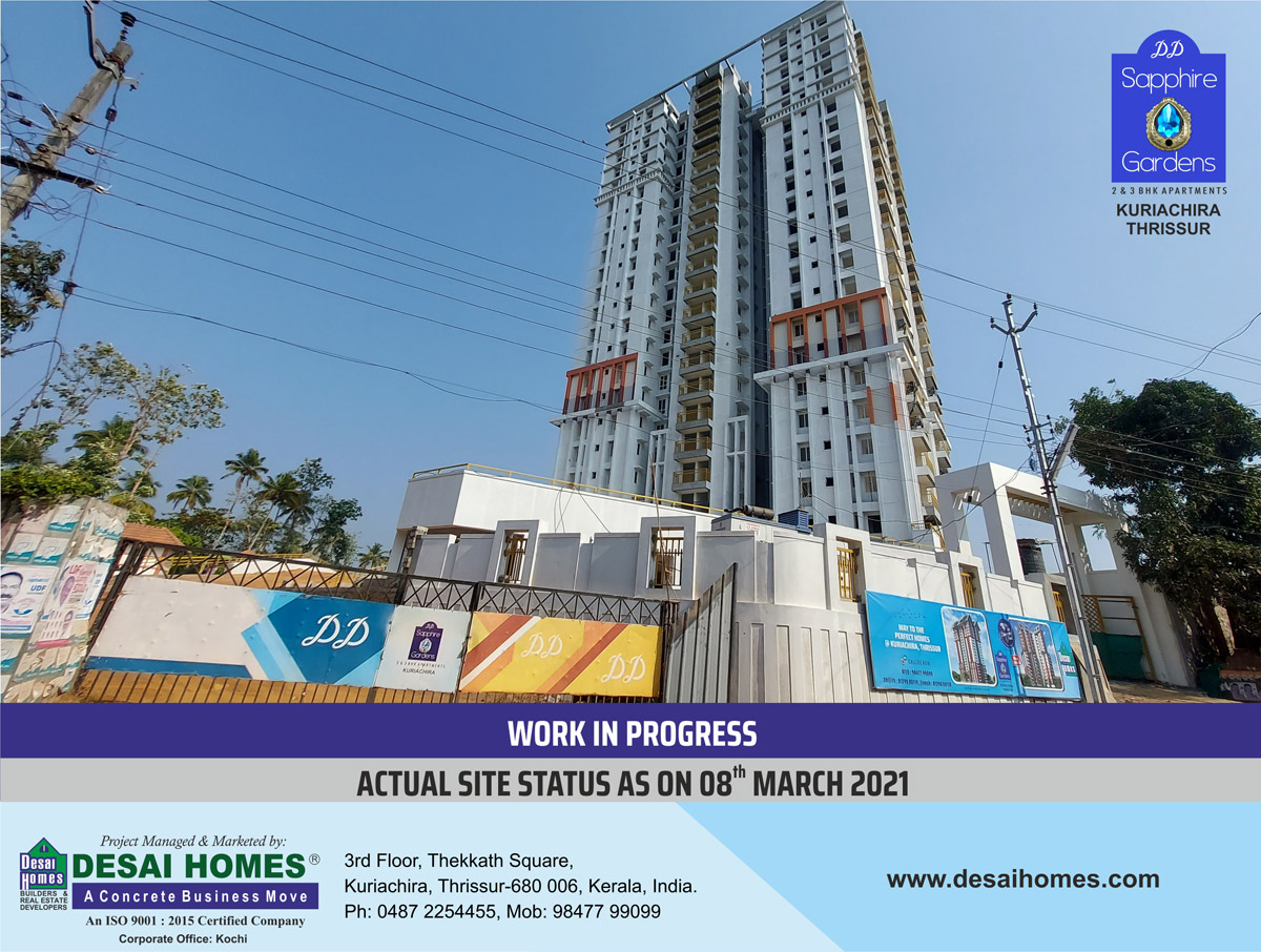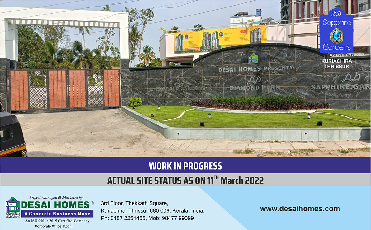 The demand for property in Thrissur has increased considerably and people looking to settle in the city can start rejoicing, as Kerala's most trusted builder Desai Homes is making their grand entry to the city with the launch of 'DD Sapphire Gardens', a majestic manner with 126 apartments, across Basement, Ground floor and 21 floors.