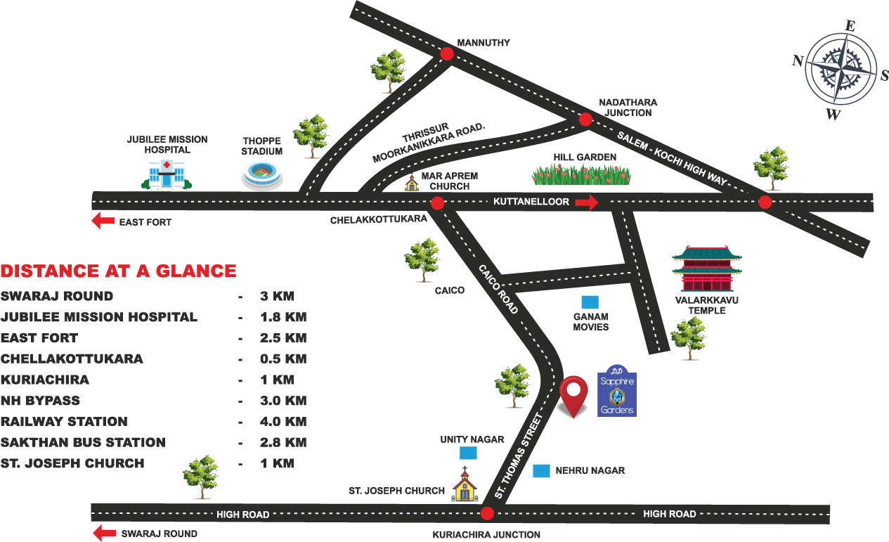This premium residential project in Kuriachira town, which is popularly known as the intellectual capital of Thrissur, is conveniently located within a short distance from Swaraj Round. The location also has proximity to popular places of worship, educational institutions, and has easy access to hospitals, shopping centres, with two major bypass roads and multiple modes of transportation facilities readily available, making it a truly connected destination