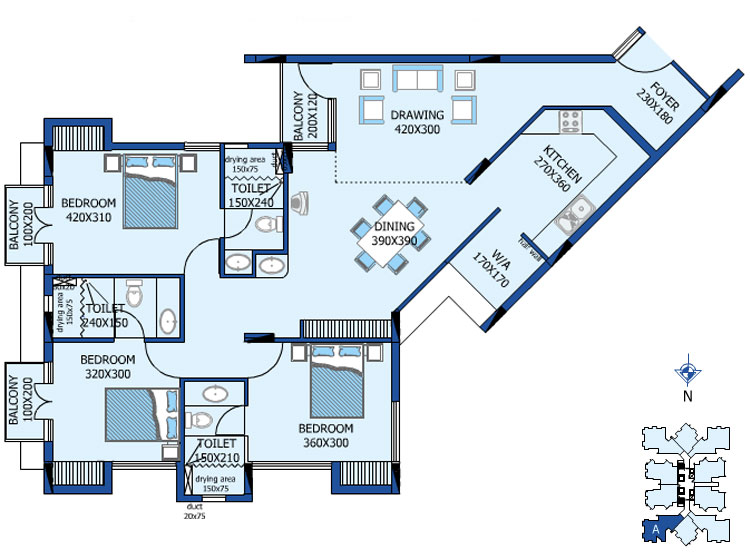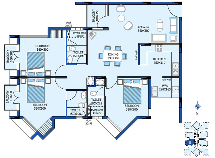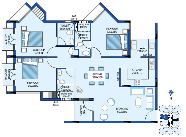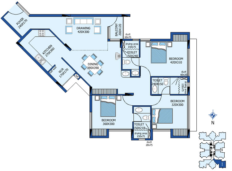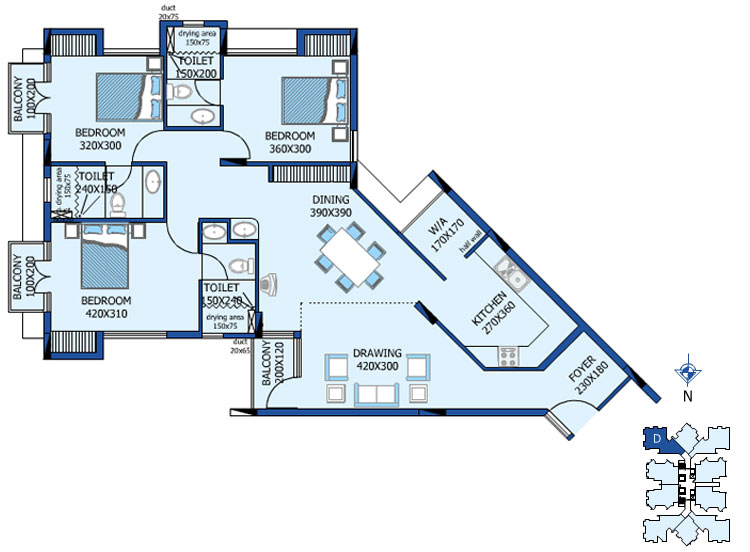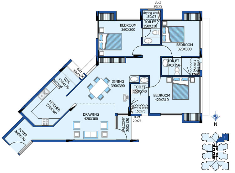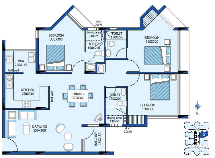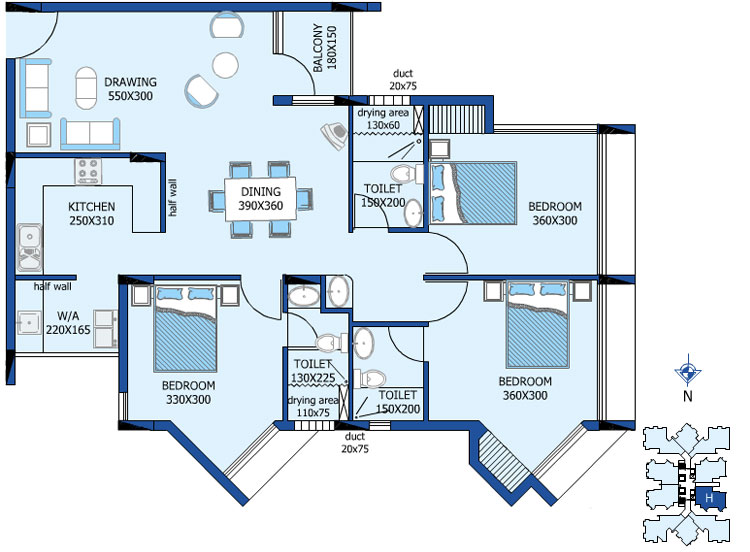 4 points in each 3BHK & 2 BHK flat, including Geyser point in all Toilets