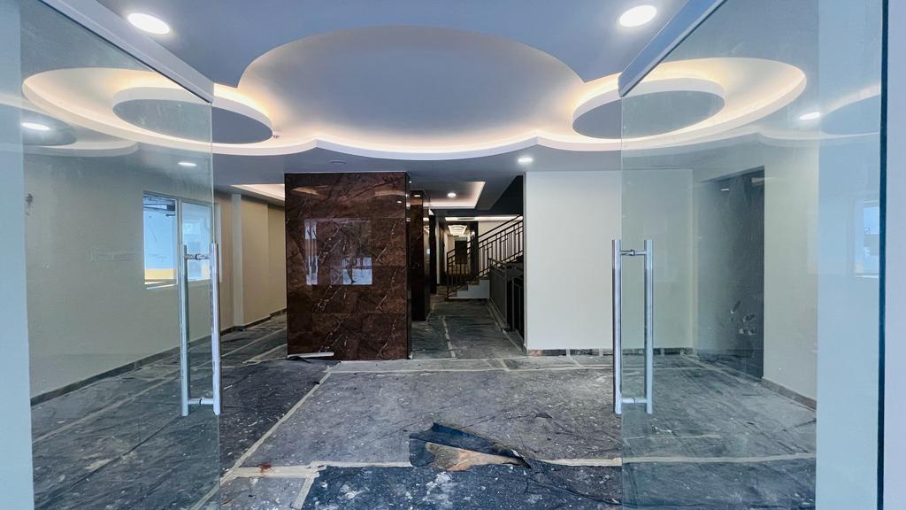 Polished front door fitted with Godrej or equivalent lock, inside paneled readymade doors and powder coated aluminium windows with glass and grill.