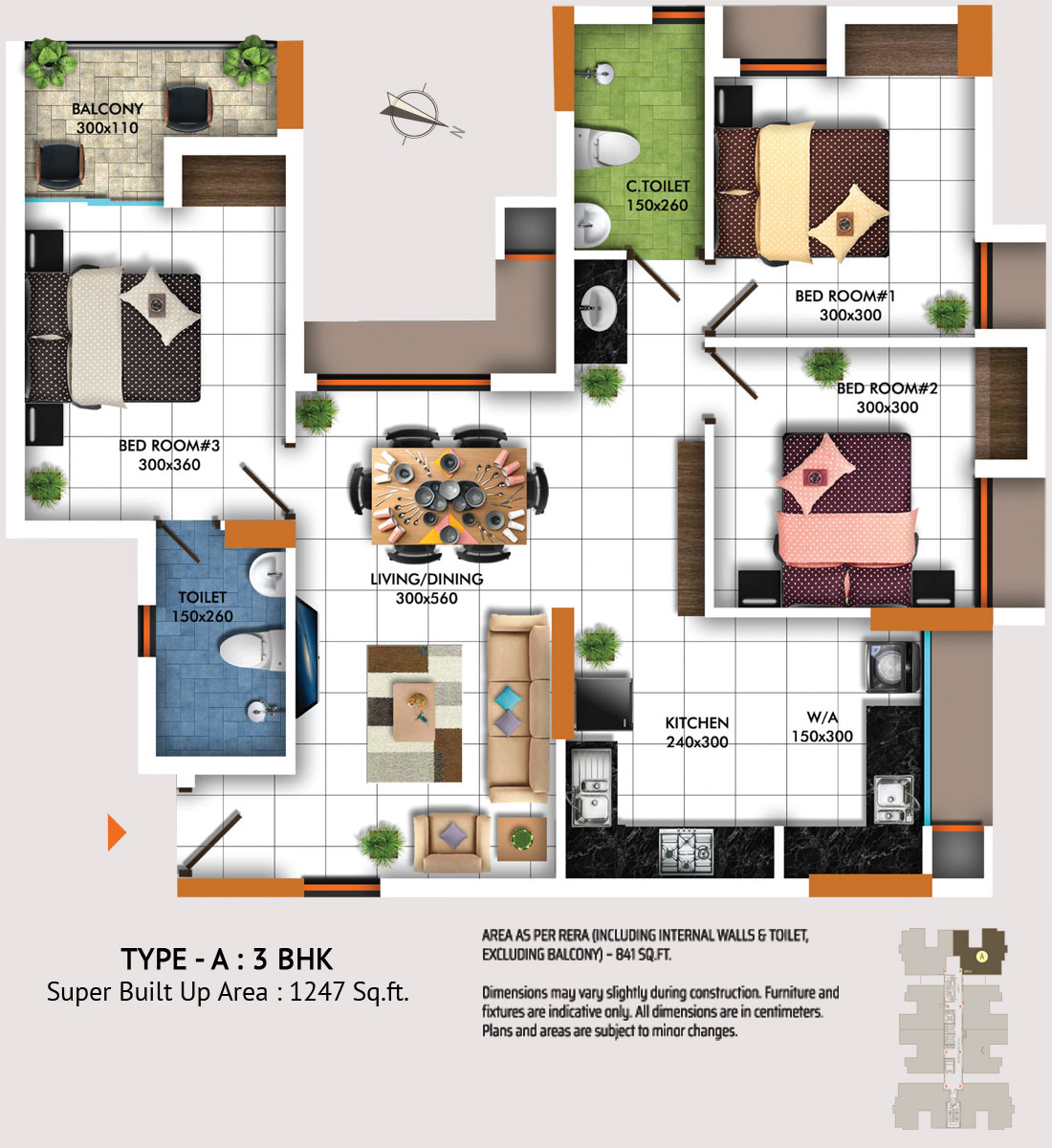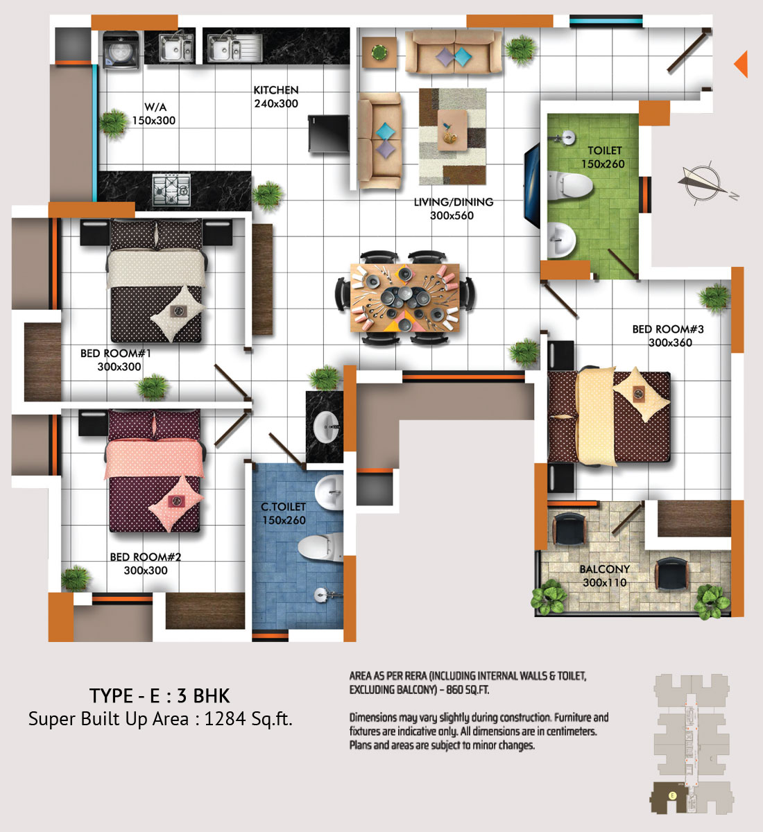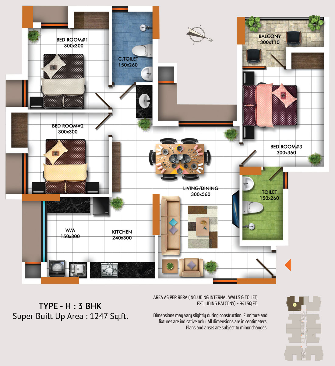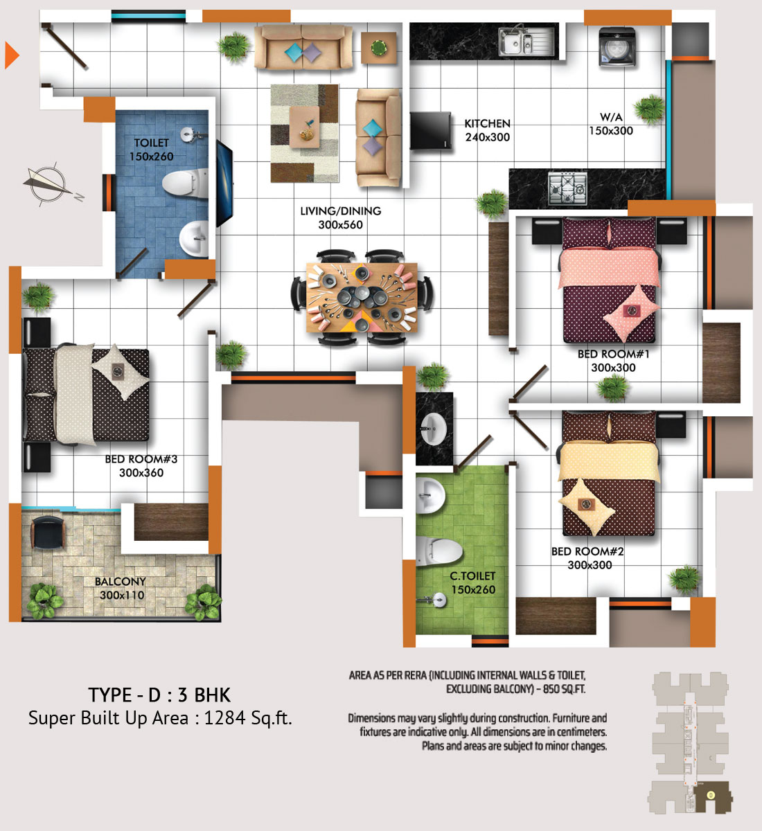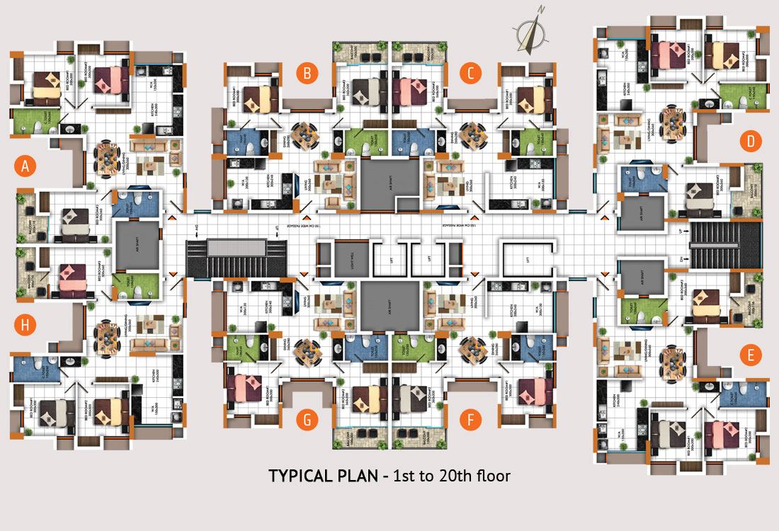 16 Amps plug point- 5 points per 3 BHK flat and 4 points per 2 BHK flat, including Geyser point in all toilets.