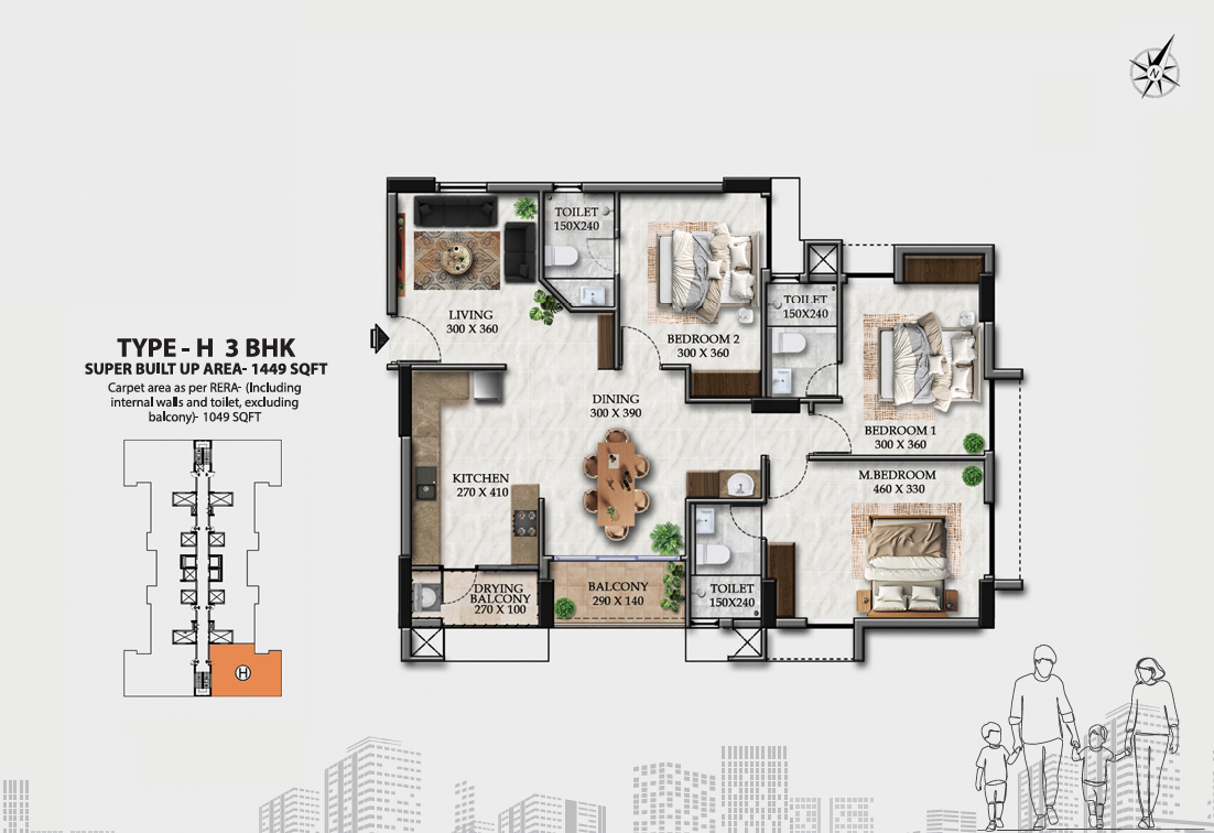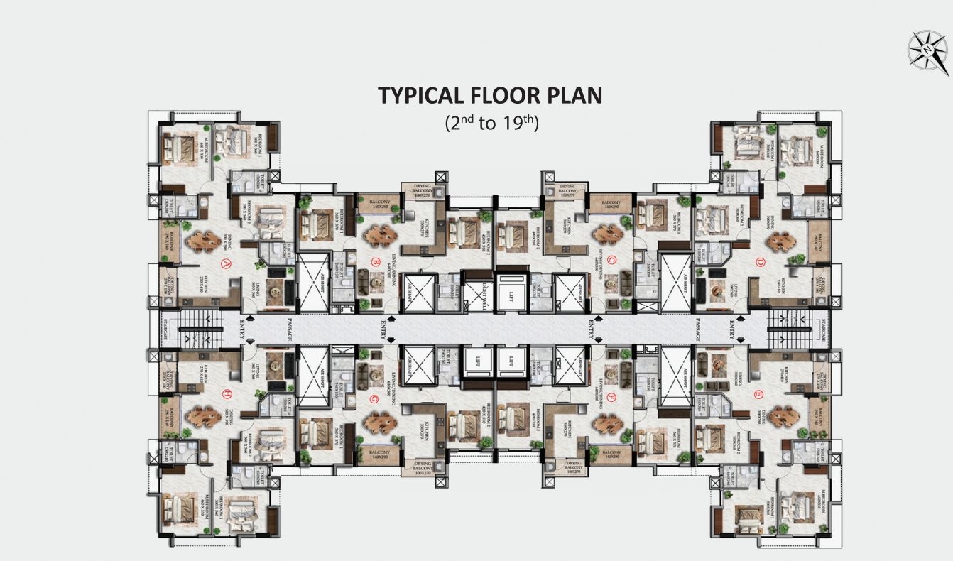 16 Amps plug point- 5 points per 3 BHK flat and 4 points per 2 BHK flat, including Geyser point in all toilets.