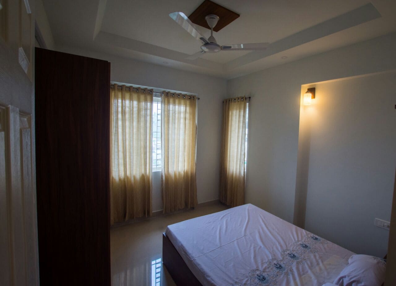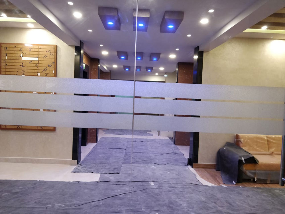 Polished front door fitted with Godrej or equivalent lock, inside paneled doors and powder coated Aluminum windows with Glass & Grill.